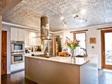 If there is a desire to process the ceiling with wooden planks, then they should be folded not close to each other, but through a short distance, which will create a “vintage” effect.The same wooden furniture decorated with metal elements will be perfectly combined with wooden planks on the ceiling. It must be remembered that light shades visually increase the space, and dark ones give the room refinement and restraint.