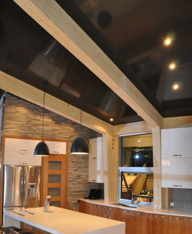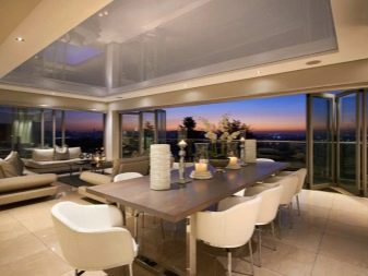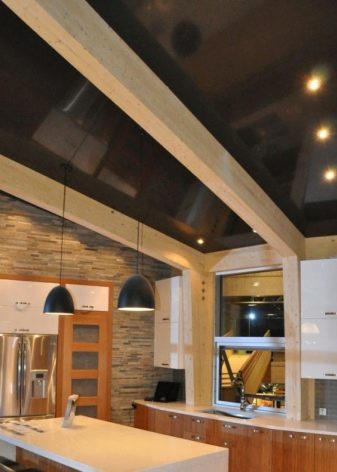 - Stretch ceiling. To carry out the work of installing it yourself will be a problem without much skill. And still need to bear in mind that the suspended ceiling reduces the height of the room, which is an integral part of this style.
