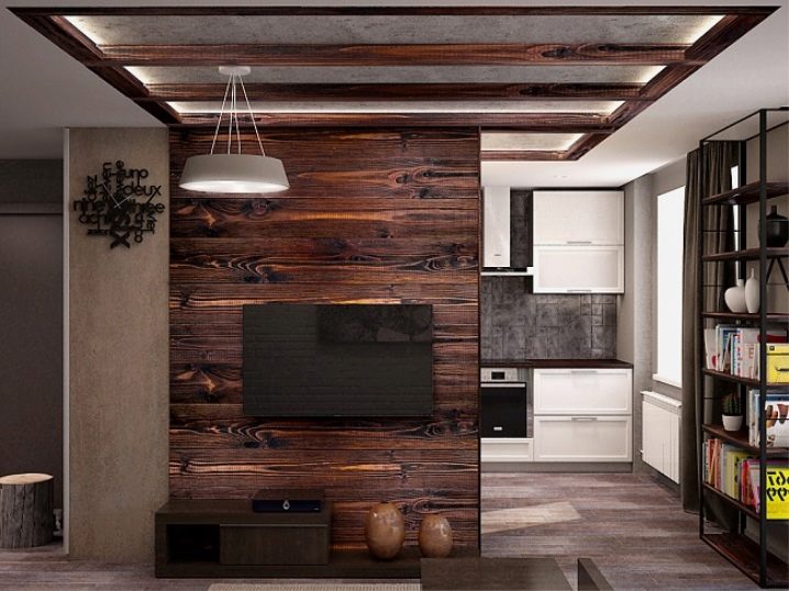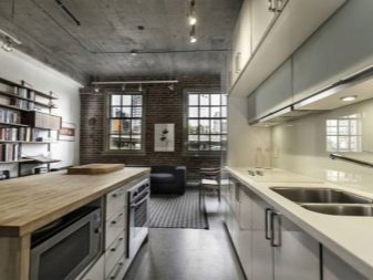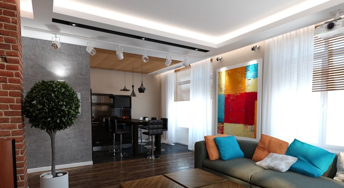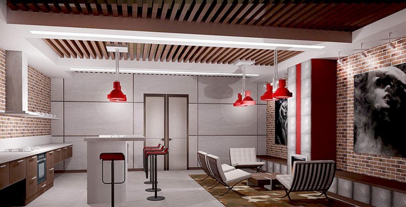 In residential premises, it is better to process the ceiling zoned throughout the apartment. For example, in the kitchen to make a brickwork, in the living room concrete pavement. To divide the studio into zones will help beams, which will be different from the walls and ceiling color. Glass partitions will also cope well with this task. The ceiling in the bathroom due to the environment with high humidity is best treated with a concrete coating and protective lacquer than using wood or any other.