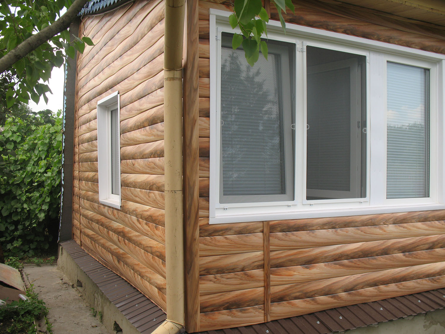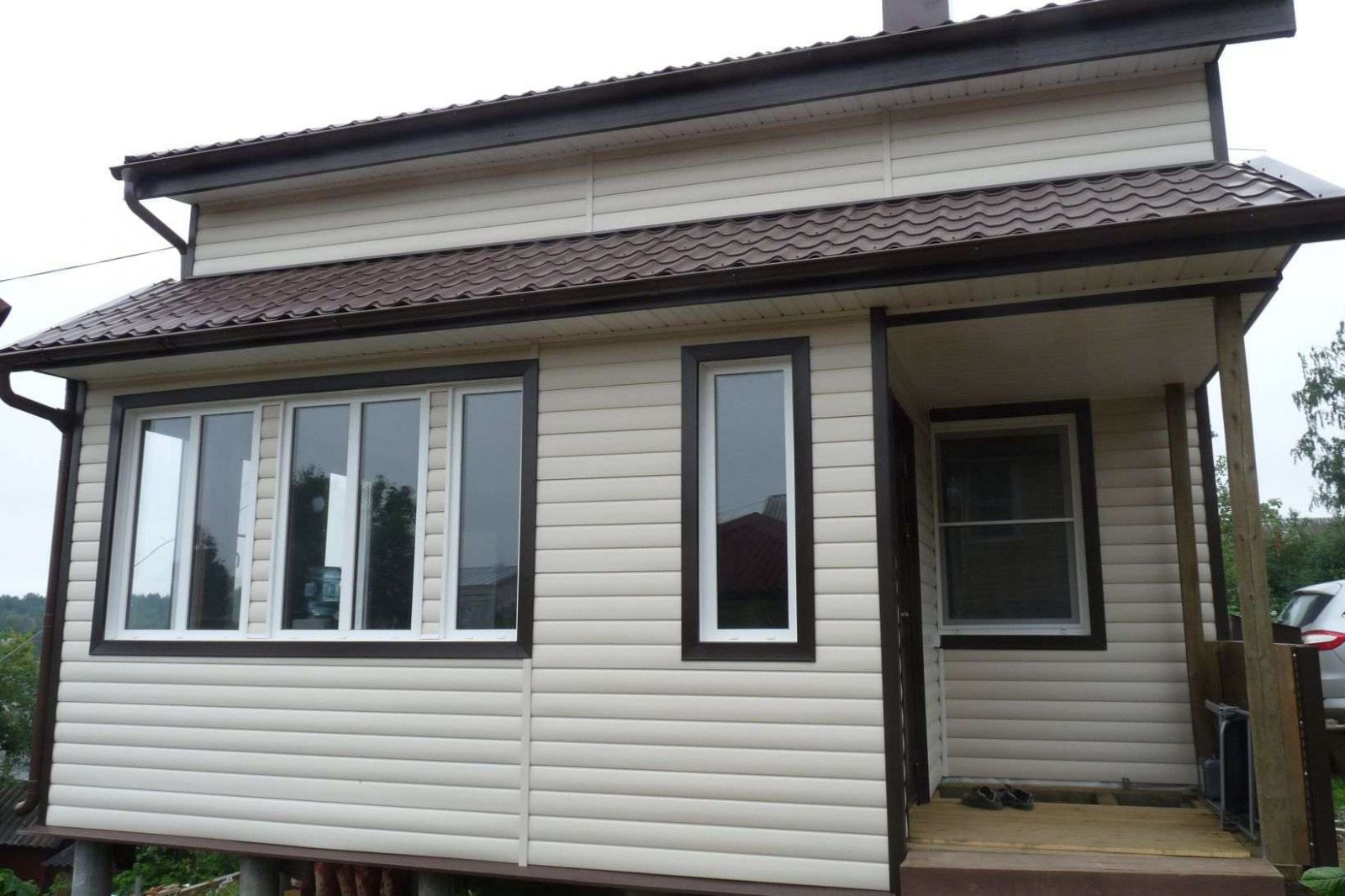 In these examples, not real wood is used, but real vinyl siding. Here you can clearly see how, due to the high-quality selection of material, the house is transformed before our eyes.