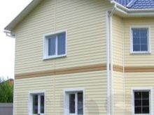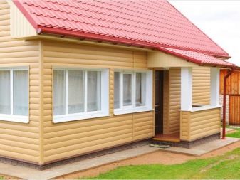 - Block house it is presented by pleasant shades: "peach", "banana", "caramel", "lemon". Horizontal panels look as if one board is located above the second, imitating natural wood. Siding allows you to give the house a luxurious look.