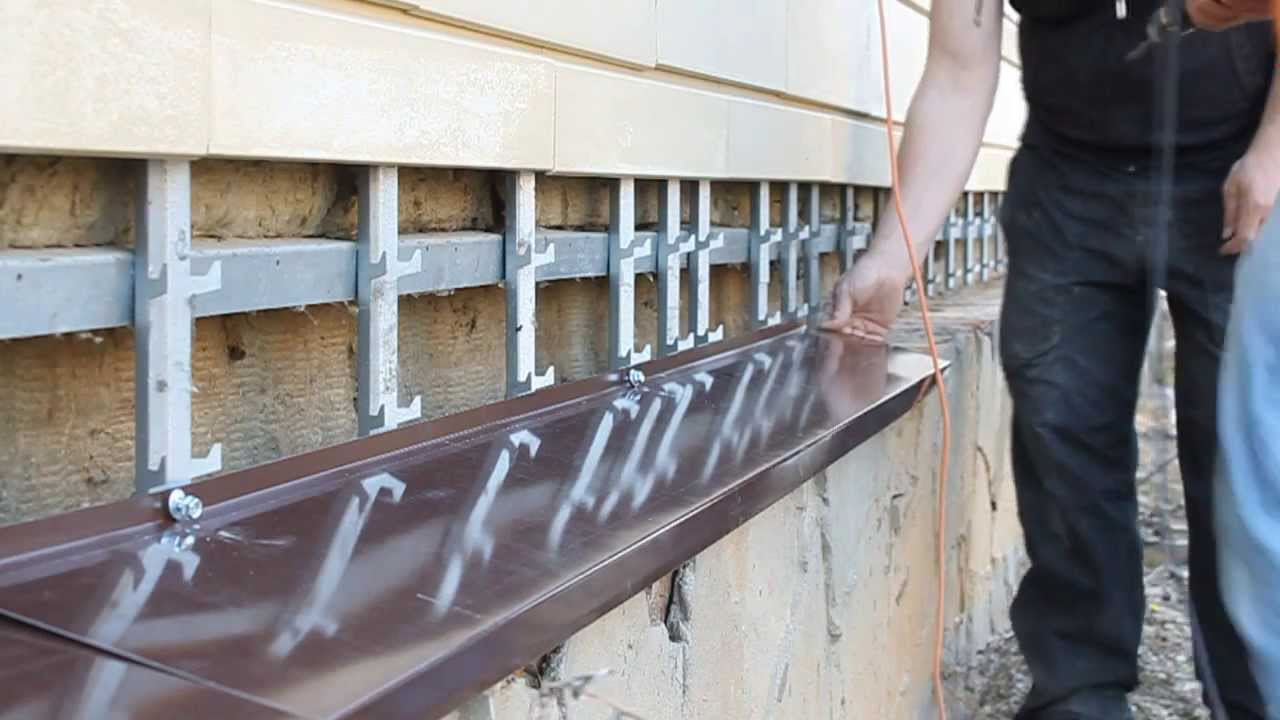 After all openings are closed and parts are mounted, the installation of the main cladding begins. The panels are fixed in the lock and inserted vertically into the grooves of the corner parts. Inter-row joints are closed with an H-type profile vertically. Under it is crate.