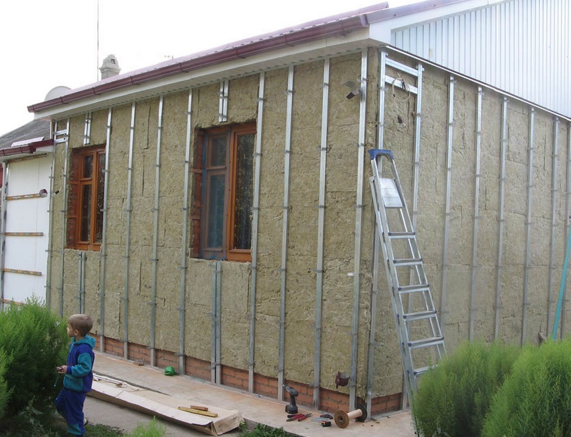The preparatory stage of finishing the facade of the building includes the installation of the batten, insulation and vapor barrier material on the walls.