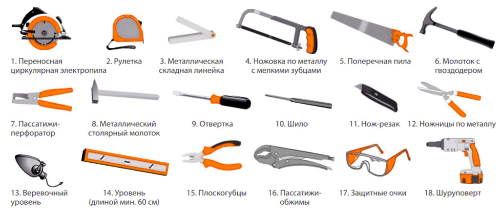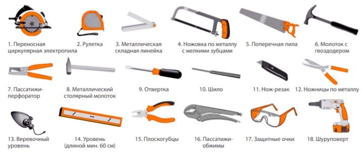 In the process, you may need to create additional holes, so it is logical to prepare a punch. Screwdriver is required for screwing screws. If nails are used, then do not do without a hammer. It is possible to twist self-tapping screws with a sealant, using a drill with a special nozzle.