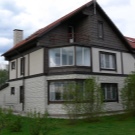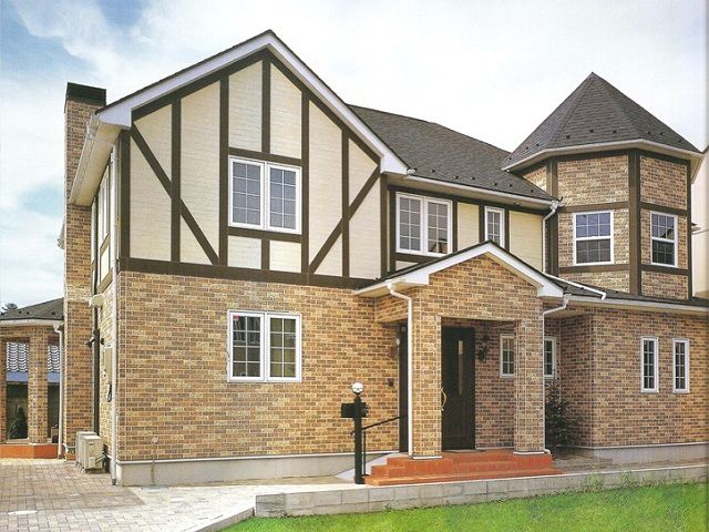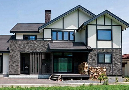Looking at this house, we seem to be transported to medieval Europe. The walls of a squat massive construction are sheathed mainly with basement siding, in some places a contrasting light surface is visible. The composition is completed with decorative dark beams.