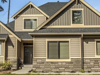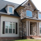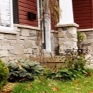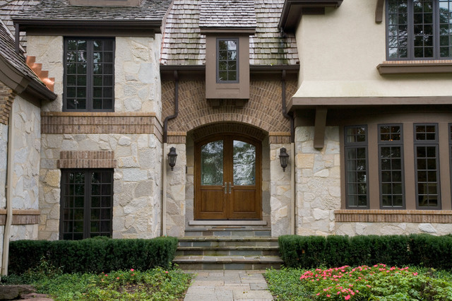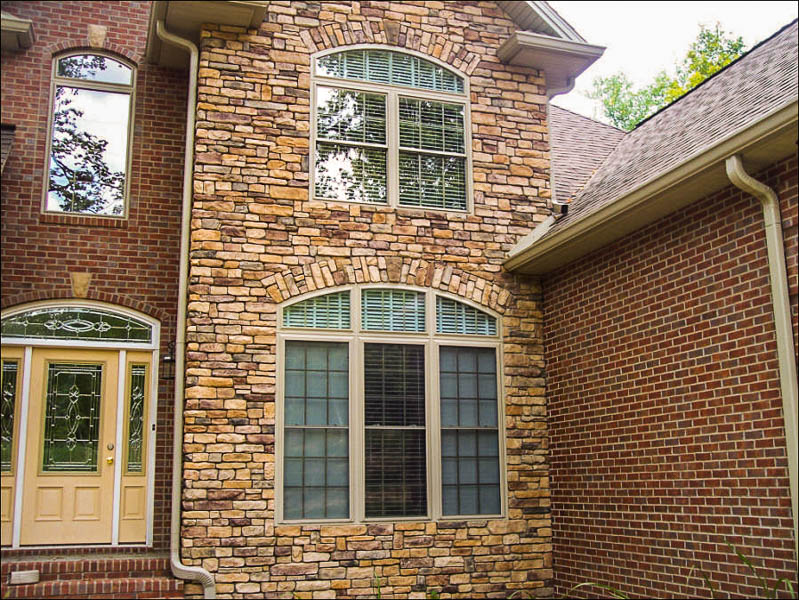 An ordinary house is decorated with an unusual composition of siding. Monotonous "stone" surface of the wall is cut by inserts front panels, complementing its color and contrasting texture.