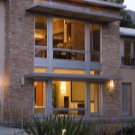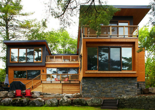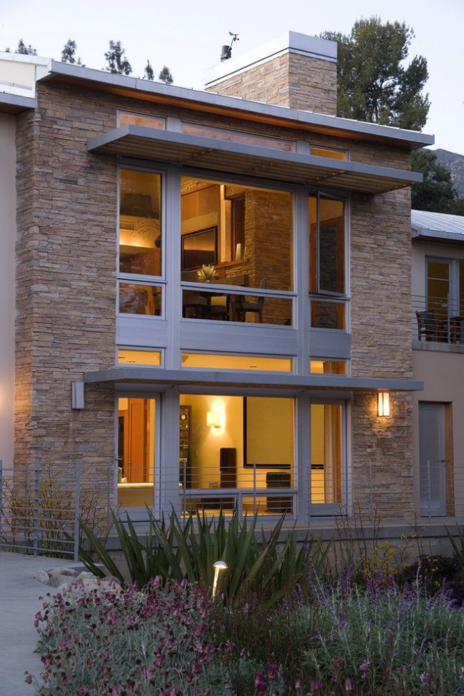 Sheathing siding is suitable not only for historic-style mansions. A modern minimalist building in the photo without finishing would look more simple. Notice how the light narrow strips of stone emphasize other horizontal elements.