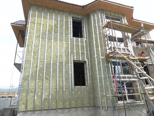 - Fastening crates - metal guides. If the wall needs to be warmed, the crate is installed in two layers: vertical and horizontal bearing. There must be at least 3 cm between the frame and the blind area of the building. This gap will compensate for the winter swelling of the ground and ensure the ventilation of the facade.