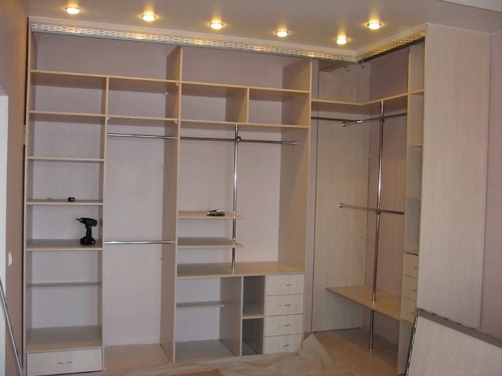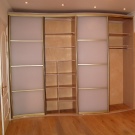 - then the frame is made of timber or metal slats: first vertically (cabinet height) and horizontally (cabinet width) the beam is fixed to the wall, then to the floor and ceiling (cabinet depth), then vertical outer bars are installed, and then the transverse rail is inserted between them. In the same order, internal partitions are mounted between the sections;