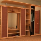 Cabinet along the entire length of the wall. A good solution is to install the cabinet along the entire length of the wall. Firstly, the room is not broken by the corners of the furniture and does not visually lose space. Secondly, such a wardrobe can serve not only as a wardrobe, but also as a pantry, where skates, skates, skis and even car tires are stored.