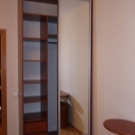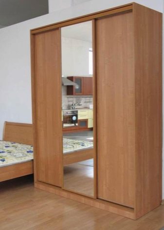 The wardrobe can separate the hallway area from the living area in studio apartments. The wardrobe is installed across the entire width of the room; a through-door compartment is made in its center, and a clothing compartment on the sides. Some people prefer to do all the doors from two sides, which provides access to clothes from the hallway and the bedroom at the same time. A very convenient option when access to outerwear is from the hallway, and access to bed linen - from the living room.