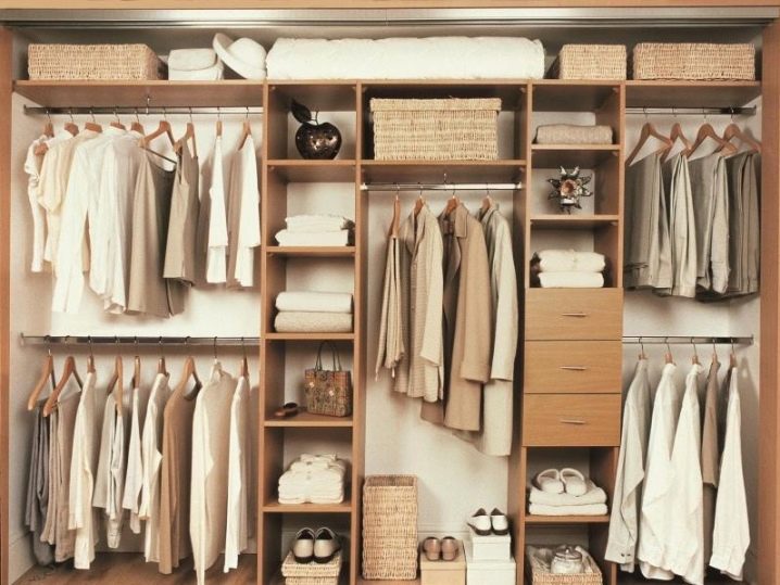 In any closet, especially if it is alone in an apartment, there should be sections for storing outerwear, shoes, hats, linen, bed linen, suitcases, pillows, blankets, dresses, jackets and trousers. The picture shows the optimal placement of sections in the closet for the hallway.