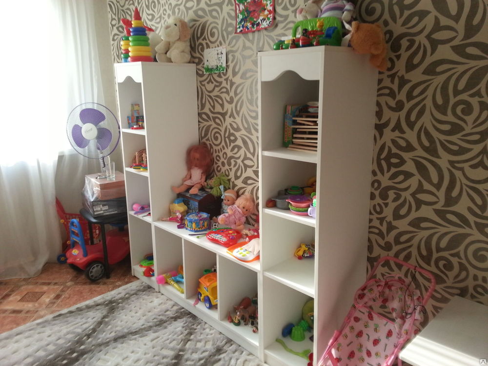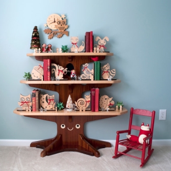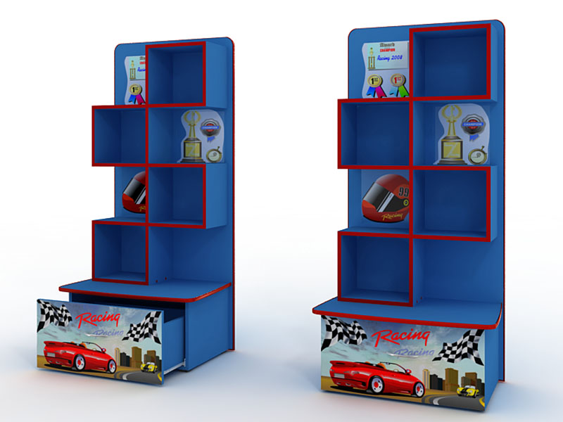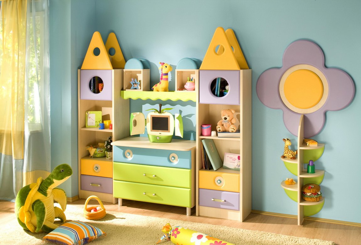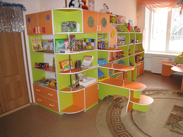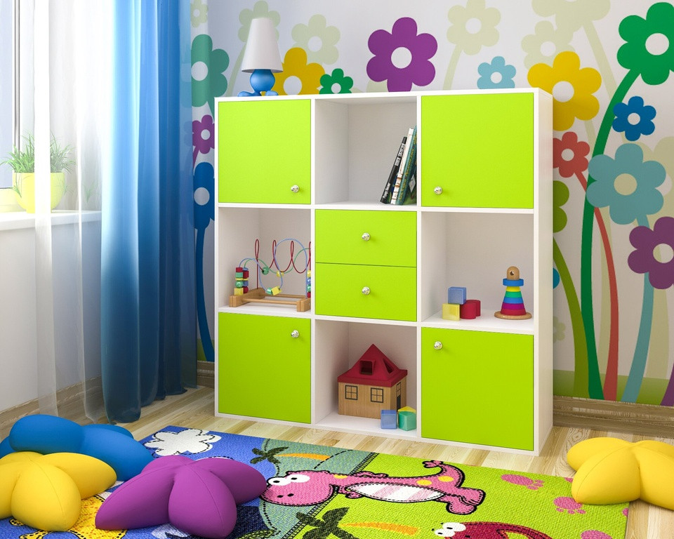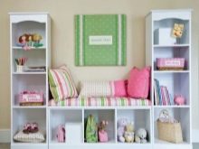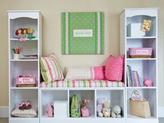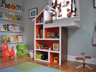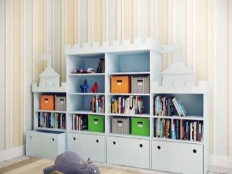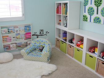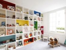 - Shelving About them was a little bit mentioned earlier. Open shelves will allow the child to independently arrange all their toy friends according to their taste and discretion. He will be able to get them and put in place when he wants, without resorting to the help of parents. It is convenient to store clothes and bed linen in the drawers of the rack. The rack can be small (3-4 sections) or the entire wall;