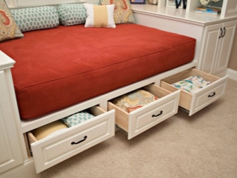 - If the area of the room does not allow enough furniture to be placed in it, you can purchase such a wonderful thing as a bed with drawers for storage. As a rule, these boxes are located on the bottom, but can also be located on the sides;
