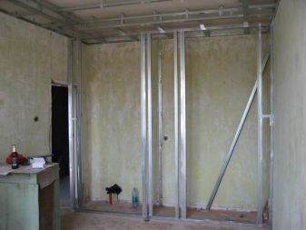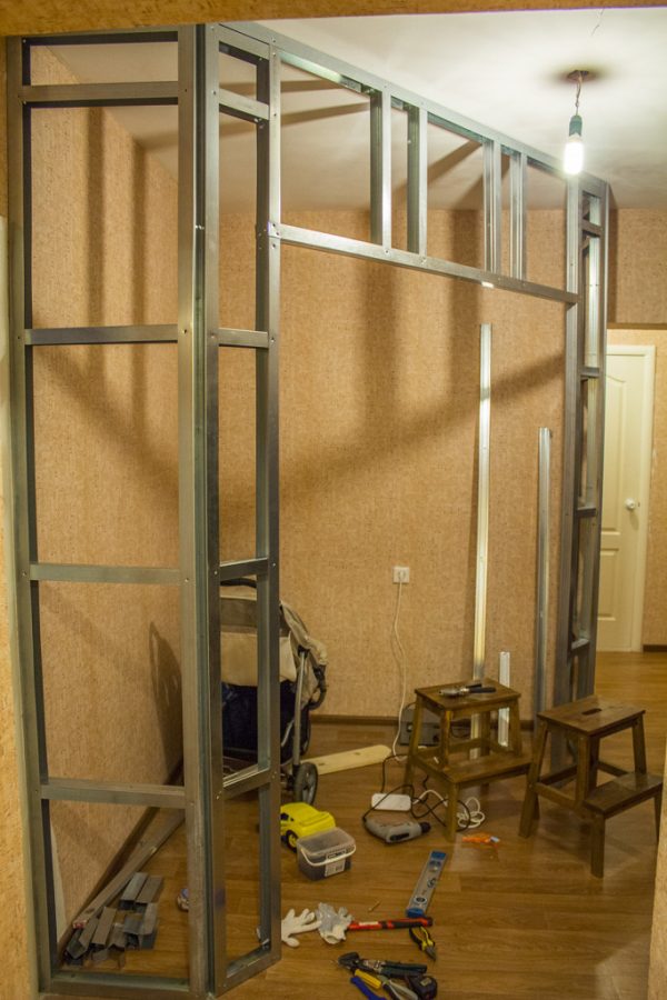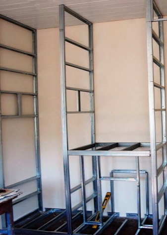 When the guides of the UD-profile are installed around the entire perimeter of the future structure, you can proceed to the installation of rack-mount (CD) profiles. The rack profile is mounted perpendicularly. Remember that each drywall sheet must be fastened on all sides. In addition, it should be borne in mind that in those places where shelves are planned, it is necessary to make their additional horizontal reinforcement with a profile. The jumper installation procedure is from top to bottom.