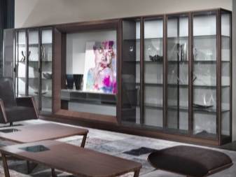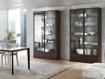- From glass - entirely not only the doors, but also the sides (at least one) of tempered glass (the so-called "showcase").You can see the contents of the cabinet from all sides, it looks great in the center of the room, but care must be taken to carefully clean the glass surfaces - the presence of fingerprints will spoil the effect.