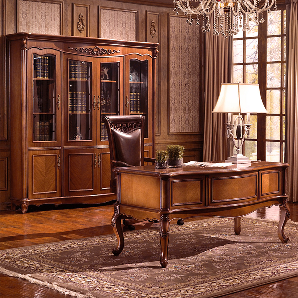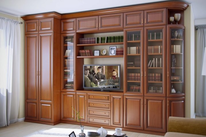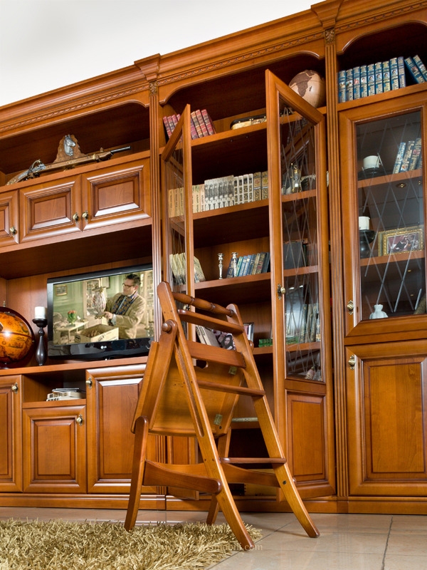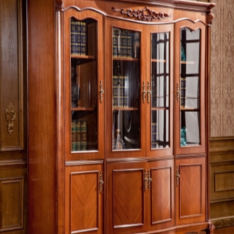 A more luxurious version of the cabinet, emphasizing the status of the owner, is the interior in noble brown tones from solid birch and MDF, finished with veneer. Decorated with carved accessories, figure details, the bookcase looks royally luxurious, recalling antiques.
