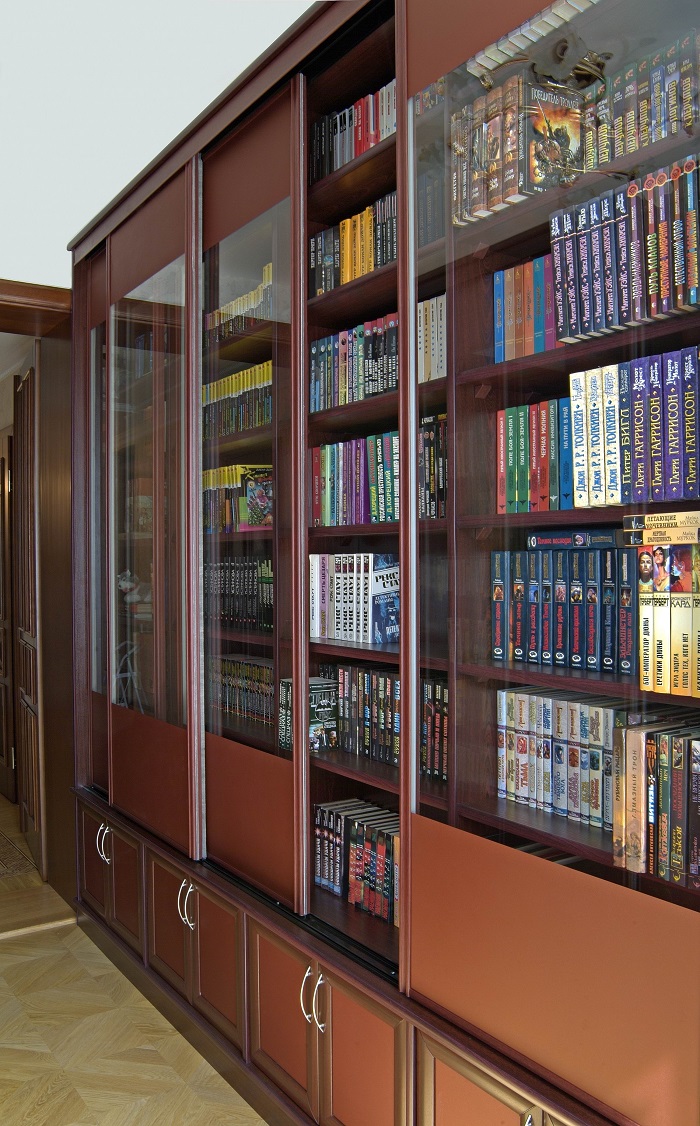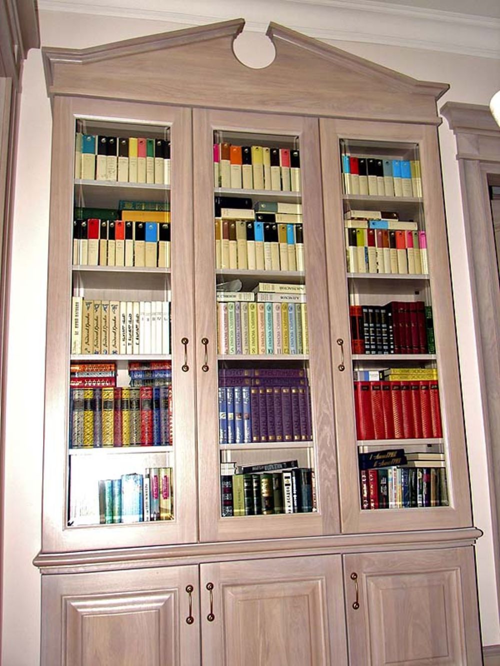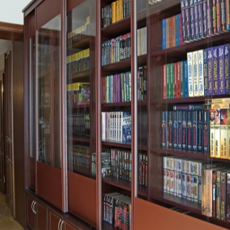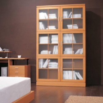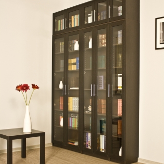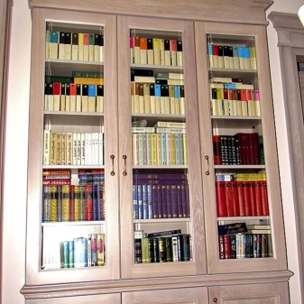 The full transparency of this piece of home furniture makes more complaints about the appearance of the collection, the state of the book roots. In extreme cases, they can be hidden from prying eyes in a closet with stained glass, which will further decorate the room. A cabinet with frosted glazing will protect books from the harmful effects of sunlight, from yellowing and fragility of paper. This applies to rare copies, especially valuable book rarities, documents.