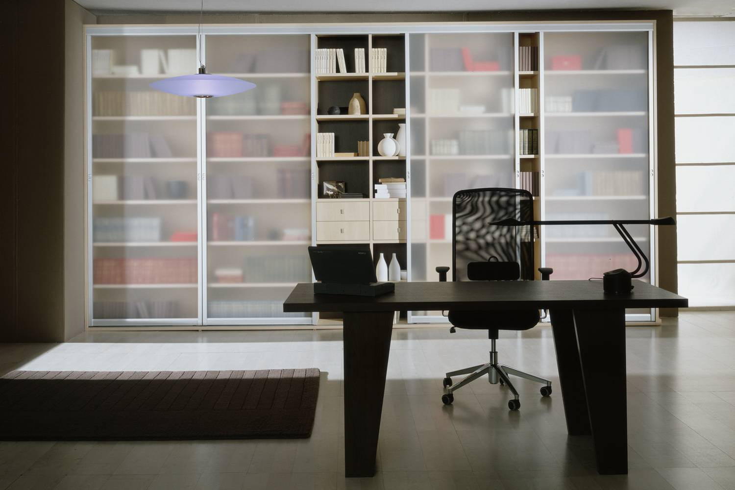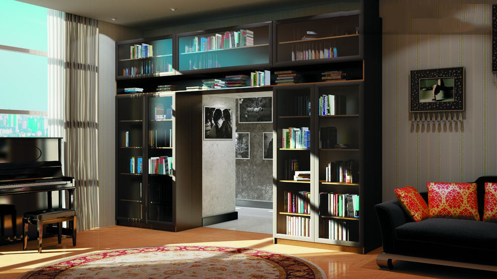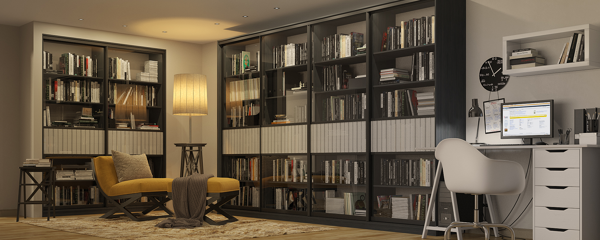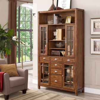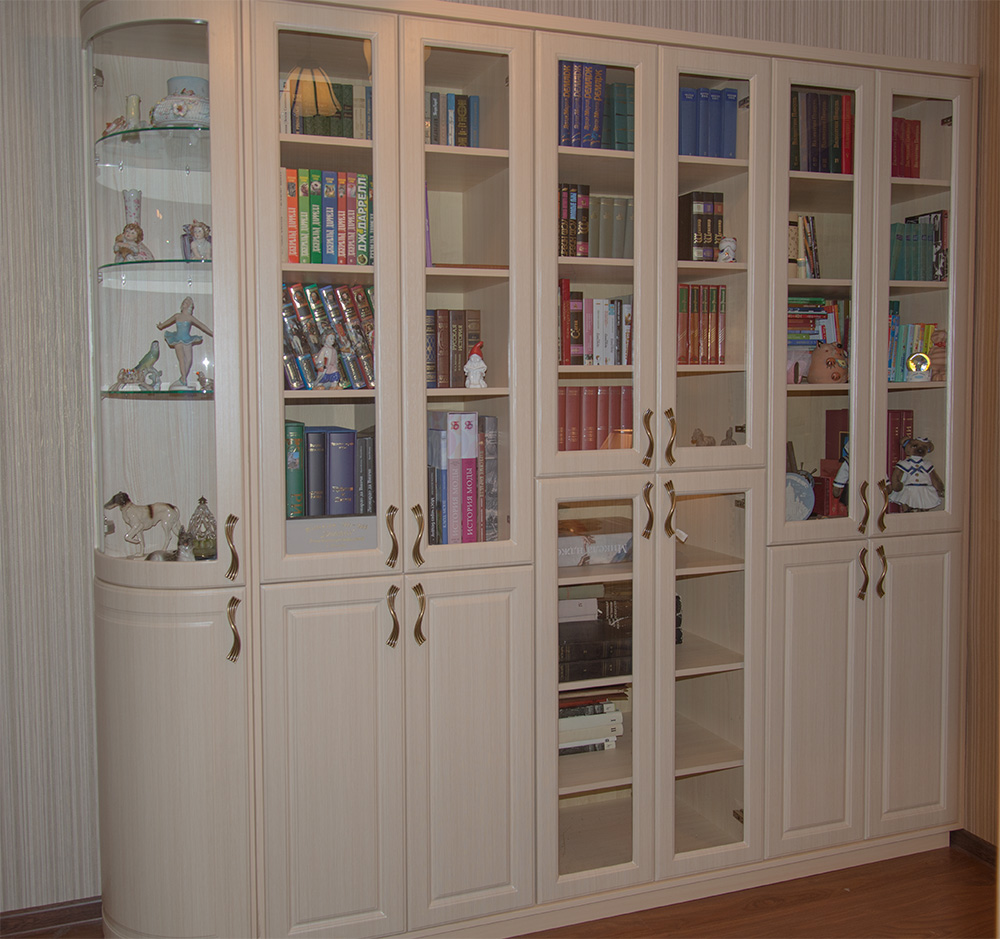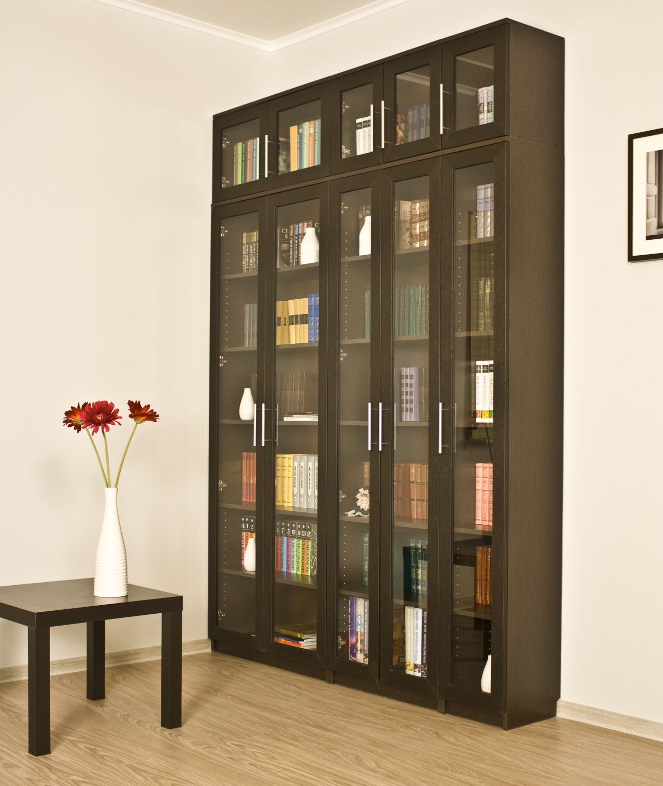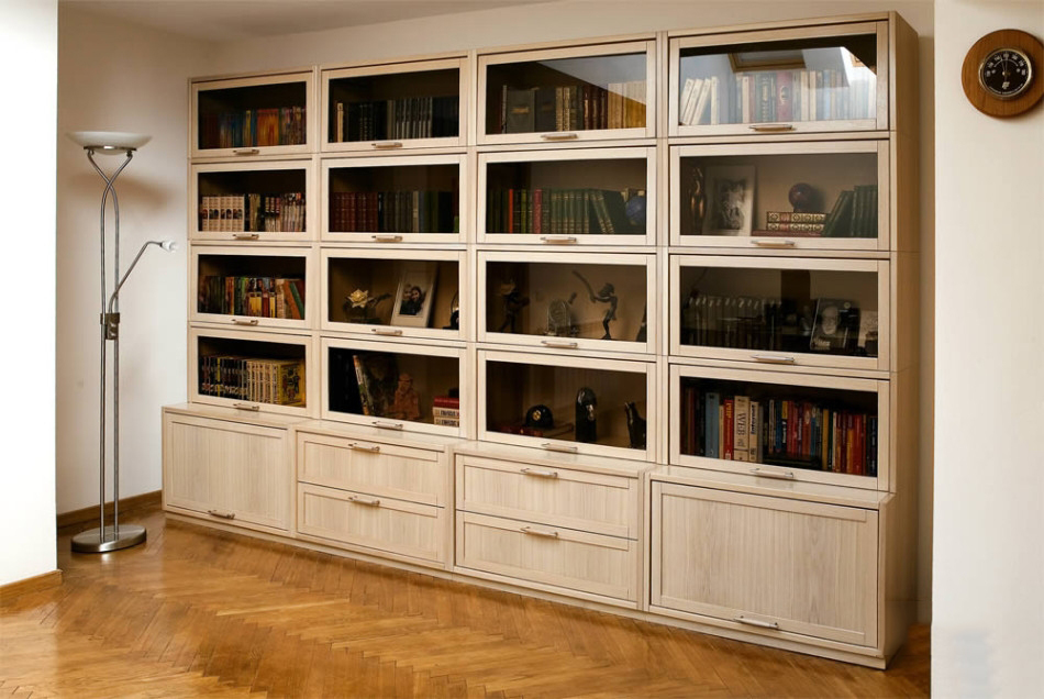 Glazed bookcases differ in the type of shutters. The doors are sliding (coupe) or swing. Swing require more space when opening, close to them you can not put other pieces of furniture. Coupe conquer increasing popularity, as they save space. Often there are flaps (bar type), opening in a vertical plane from bottom to top or top to bottom. In this case, each bookshelf has its own door.