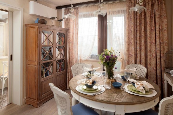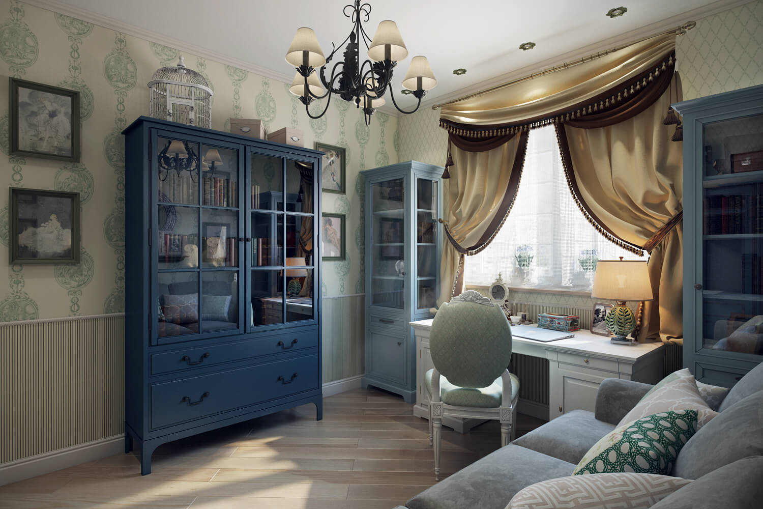 And this is another office, more feminine, in the style of Provence. Here the books are hidden behind glasses in a small blue double case with lower drawers. Due to its low legs, with all its squat, it acquires some airiness and looks like a natural and graceful addition to the environment, eliminating the bloom.
