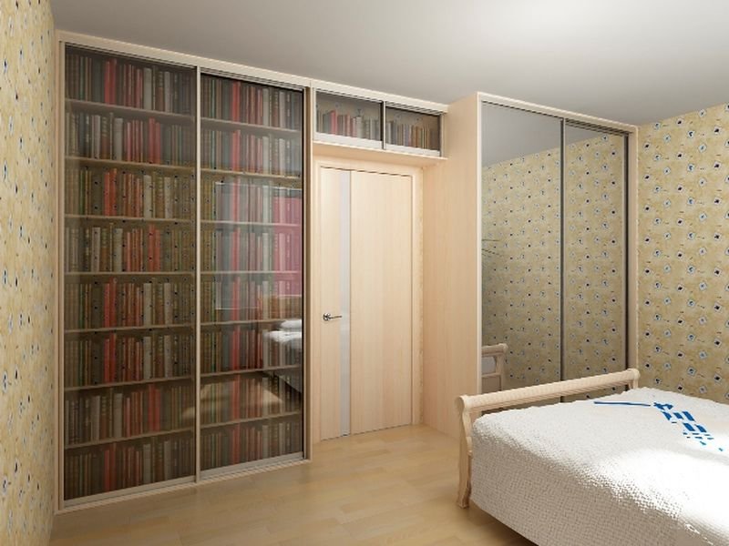 And in the tiny bedroom there was a place for a built-in book wardrobe with sliding glass compartment doors and an entresol above the entrance. A very economical placement of a rather large collection of books in a small room space.