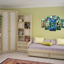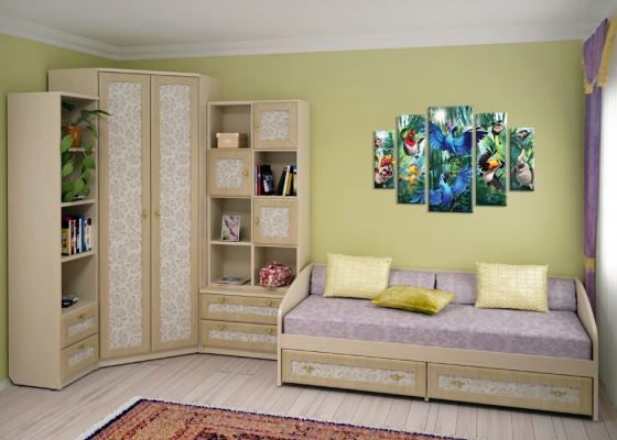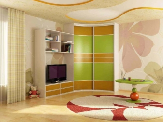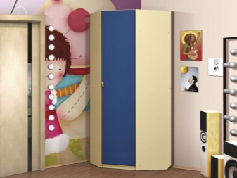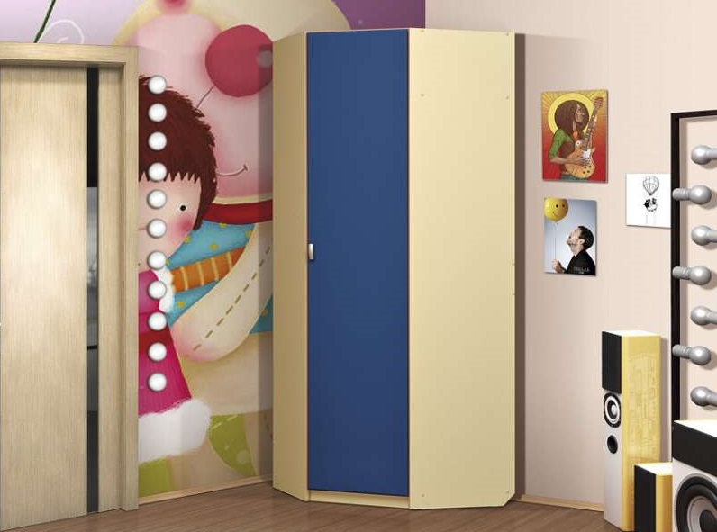 - Children's For a child's room, the use of a small corner cabinet is extremely important. After all, you need more space to take away for games and sports. Here fit a spacious trapezoidal model with additional shelves. The little inhabitant of the room will keep order, putting there his toys. A higher compartment will be used to store clothing and bed linen.