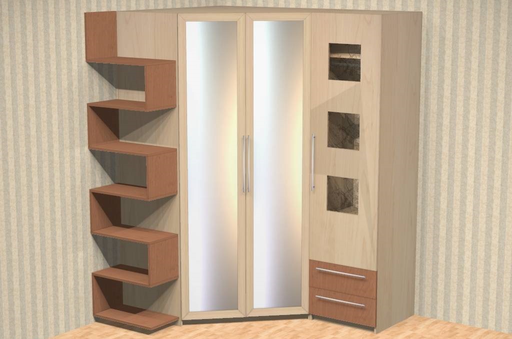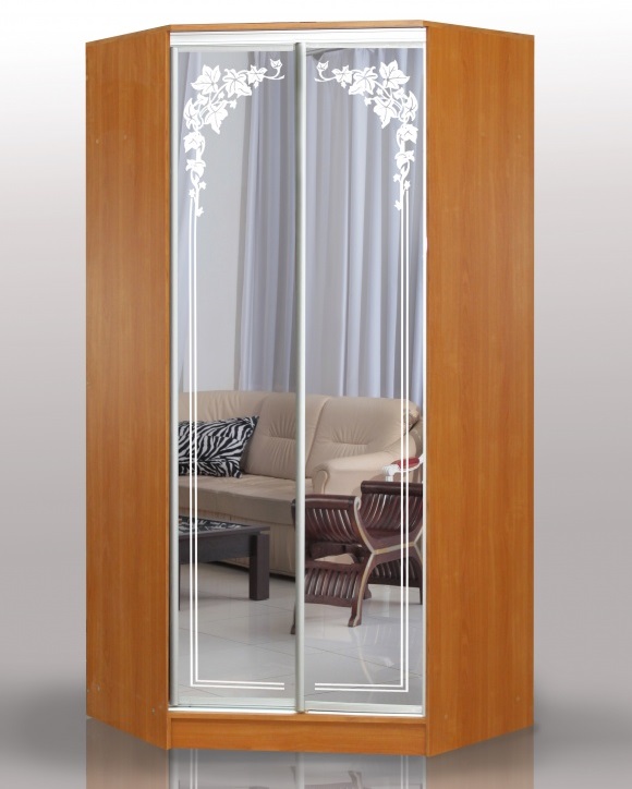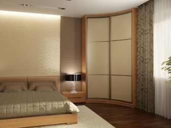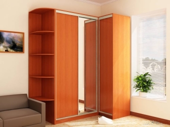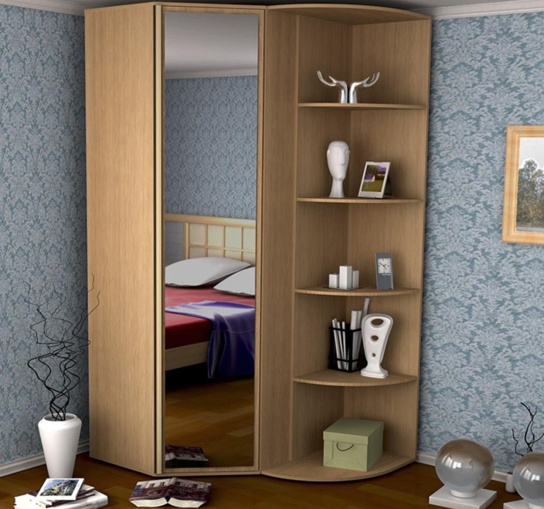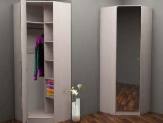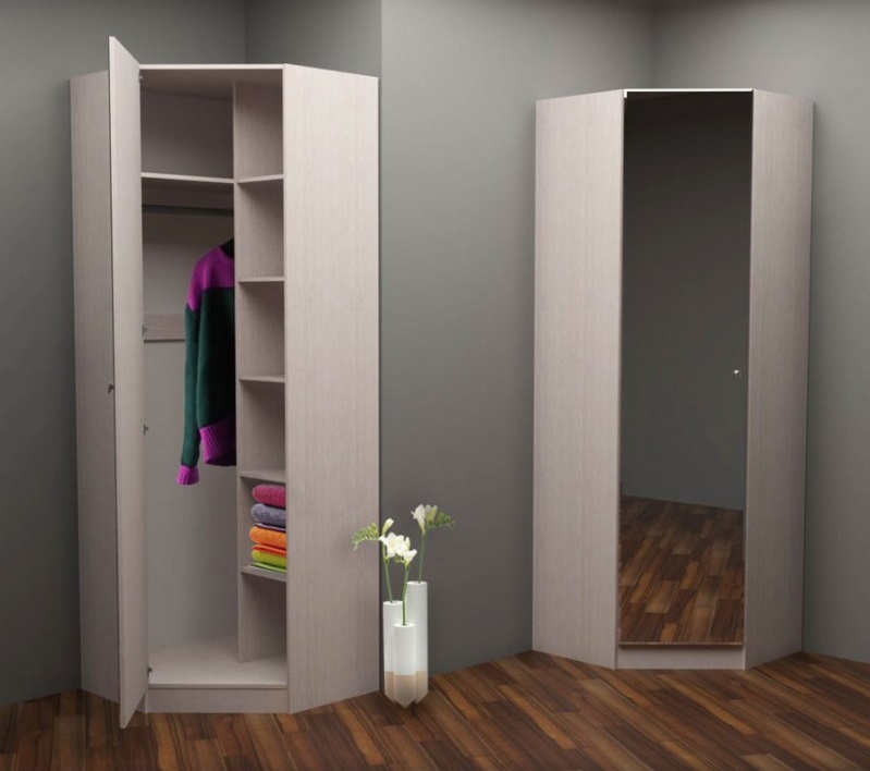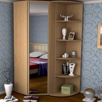 A triangular cabinet with a mirror fits well into a miniature bedroom.In color, it should be combined with the decoration of the walls so as not to visually clutter up the bedroom space.