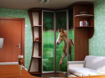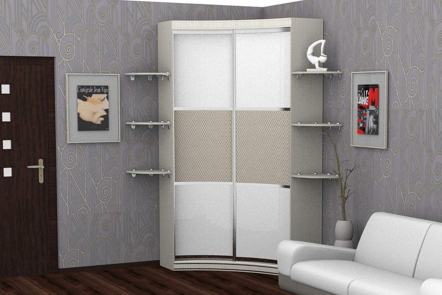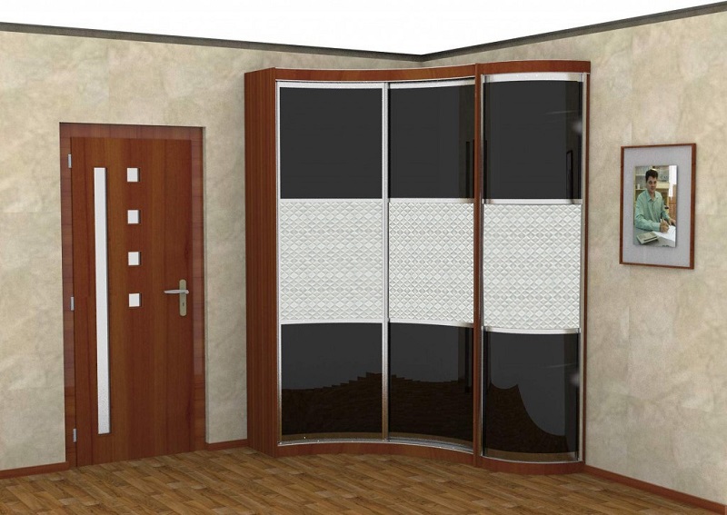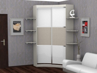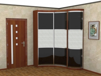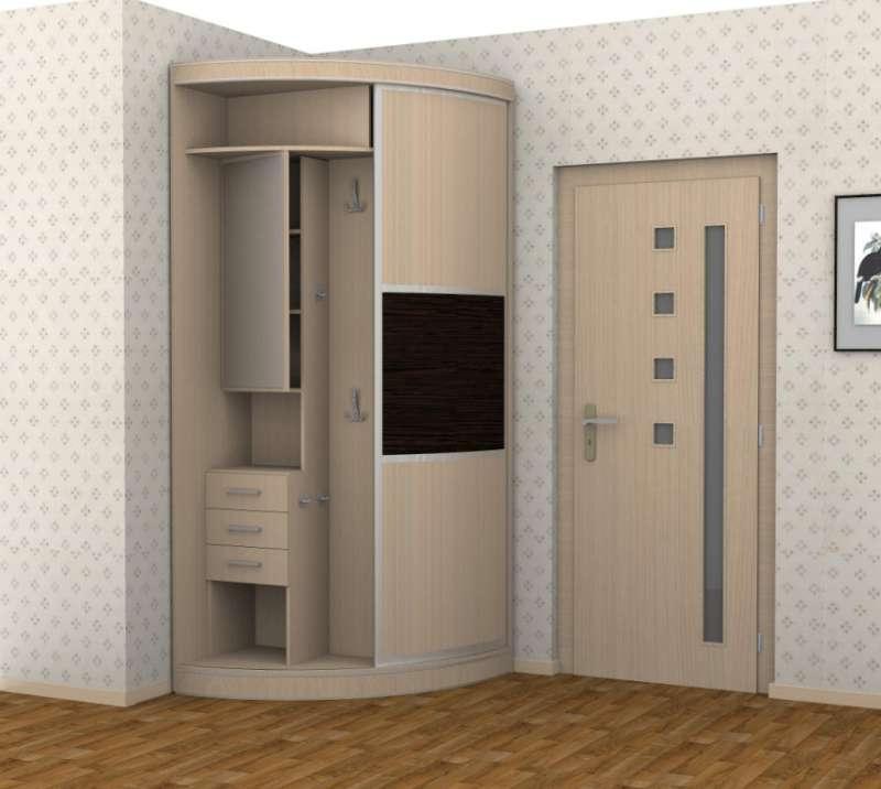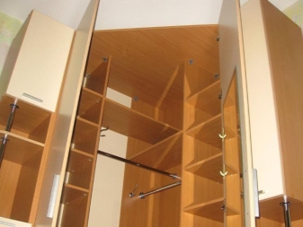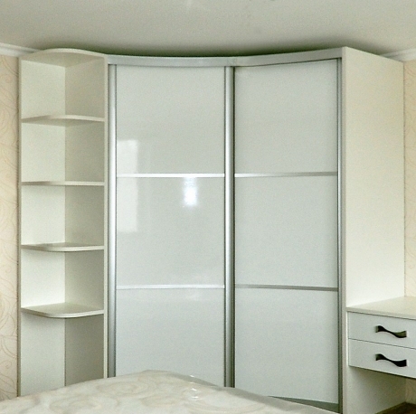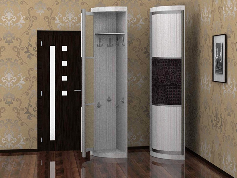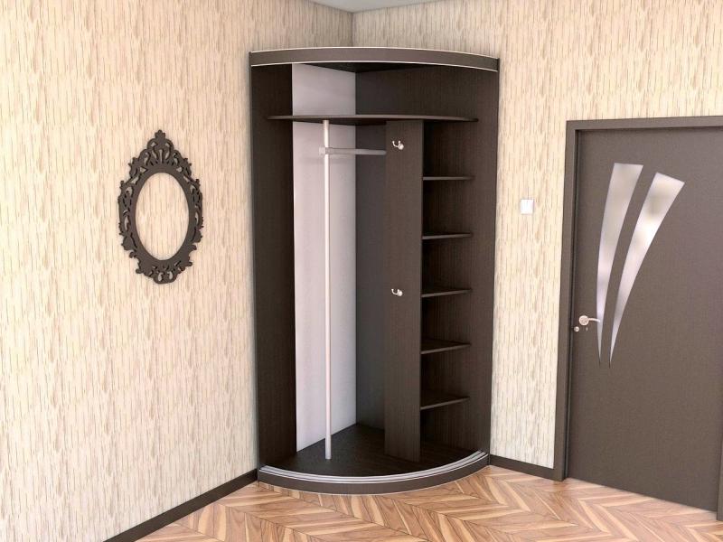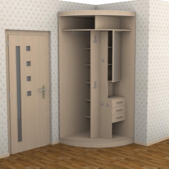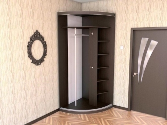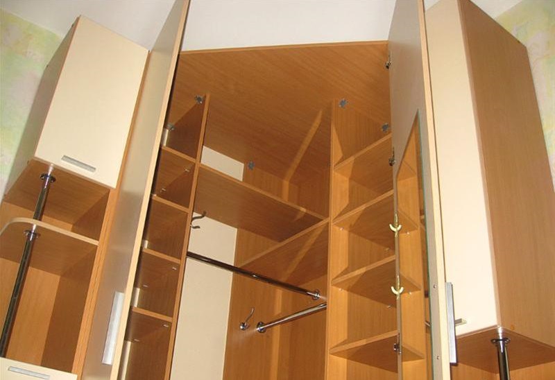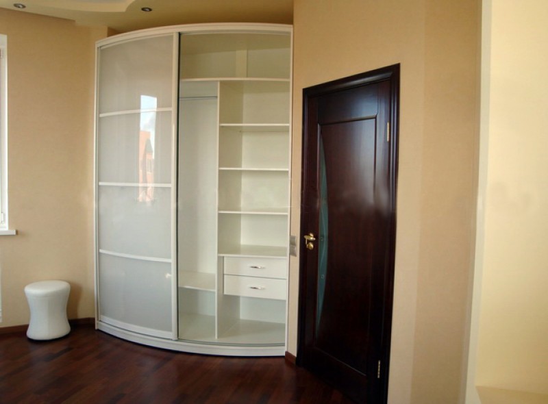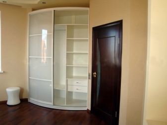 Reception of rounded corners saves space well: for example, a concave corner wardrobe. This model is equipped with an original exit system for hangers, which makes it possible to accommodate a large amount of clothing.