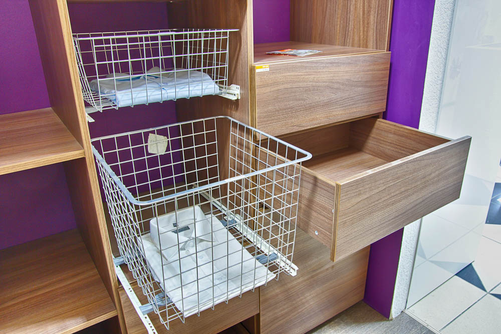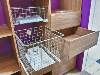 - Baskets. Boxes in the form of baskets from a grid are needed for folded clothes or shoes. Thanks to the mesh material, the contents are clearly visible, this material also contributes to the ventilation. Baskets are supplied with rollers for easy promotion.