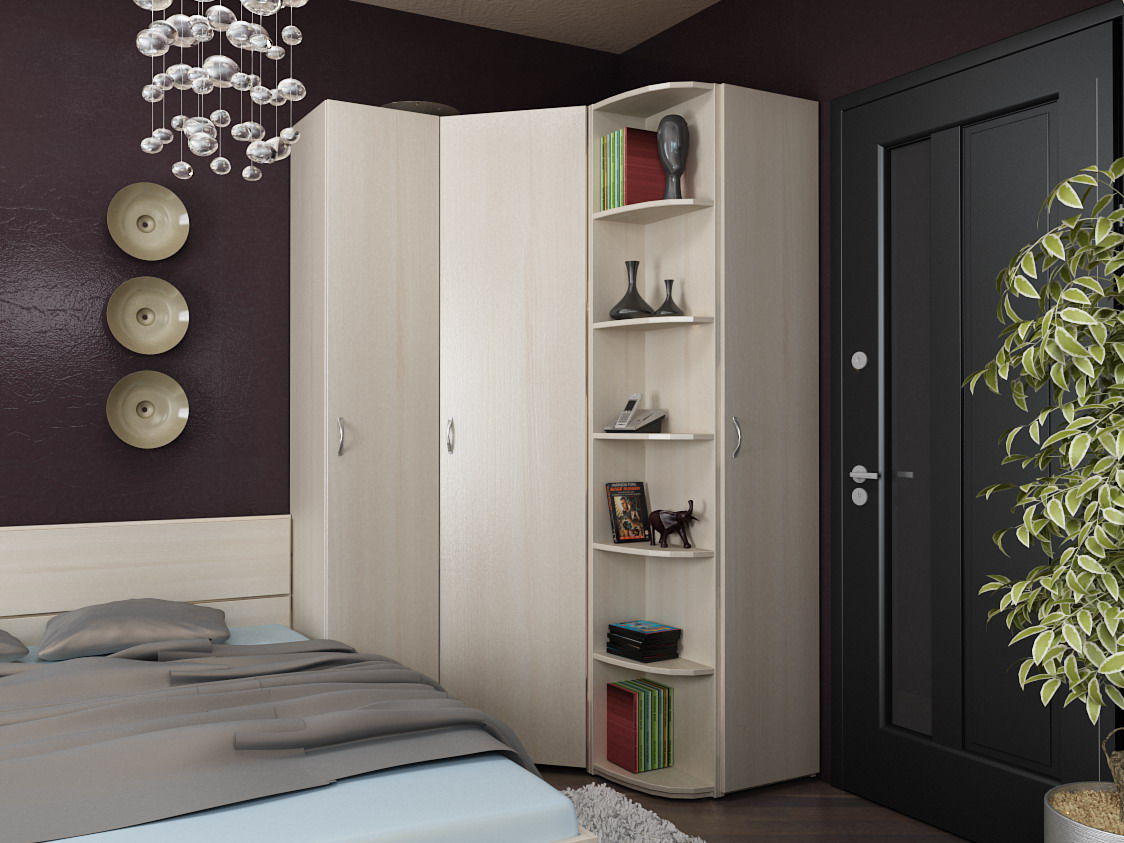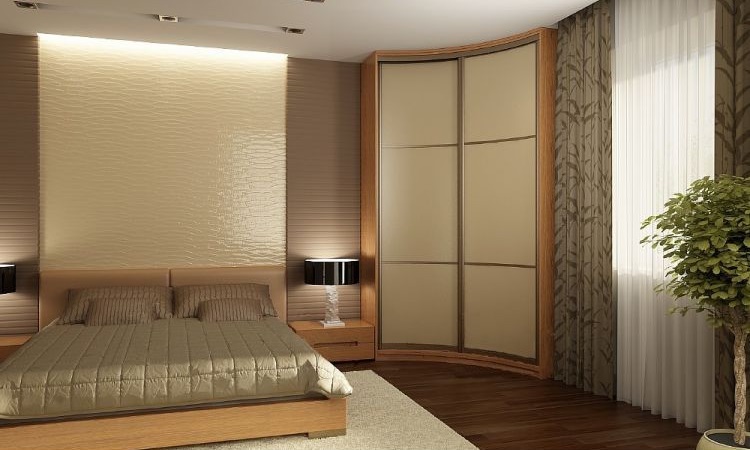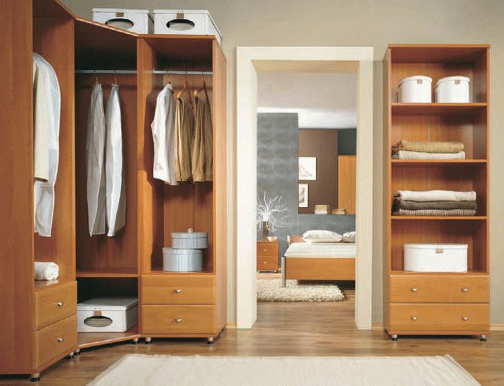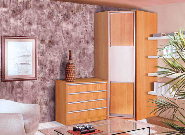 - Bedroom. Bedroom - this is a place where the closet is one of the components of the interior, along with the bed. And if the bedroom is small-sized, it is a corner cabinet that helps in solving the problem of compact storage. This configuration makes the best use of the bedroom space. The most successful option in this case is the built-in model, which is installed between two adjacent walls. Such a cabinet, taking up very little space, contains a lot of necessary things. As a rule, the product is equipped with shelves, drawers, mezzanines, and hanger bars, which are fixed at different heights for various types of clothing.