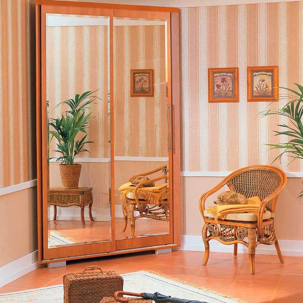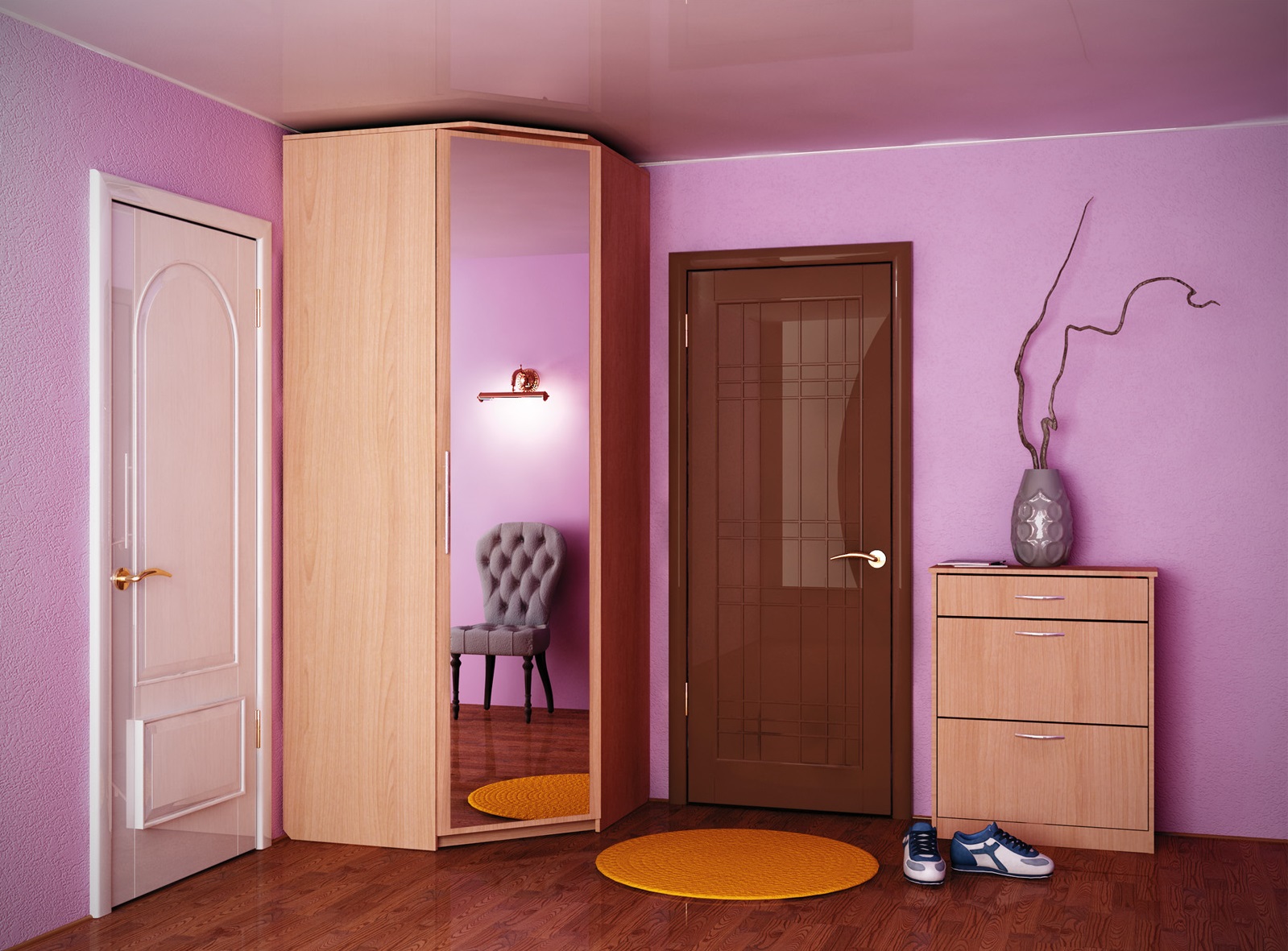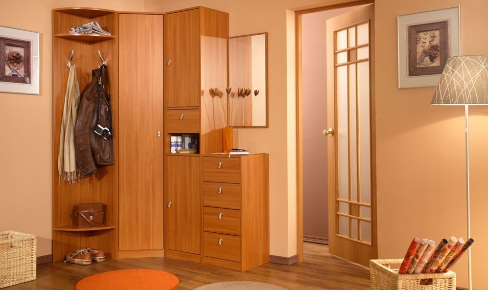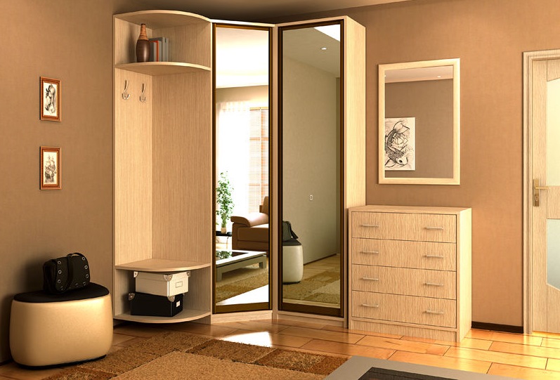 - The entrance hall. For a tiny hallway, an angular wardrobe is just a godsend. You can put clothes and shoes in it. Possessing compactness, such a cabinet usually takes place up to the ceiling, where at the top there are compartments for storing seasonal items. Visually, you can expand the space with a mirror facade, as well as light colors in the decoration. Given the whiteness of the white, preference is better to give shades of beige, lemon, pink. For example, the yellow color creates the illusion of sunlight. The mirror in the corridor also performs a functional task: you will be able to look at yourself in full growth before going out. In the narrow hallway is selected corner cabinet with a minimum depth, but high. For ease of use, it is better to equip it with exit doors or blinds.
