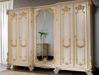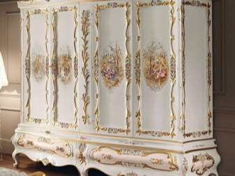 - Furniture rococo less pompous, although also filled with details and luxury. But this luxury is less heavy. Rococo cabinets look more airy and light, thanks to a more elegant decor, the predominance of bright colors. Furniture products in this style look great in free spaces that are not overloaded with other furniture.