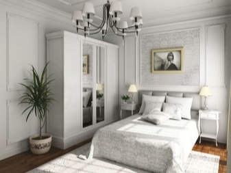 Corner wardrobe in the interior of a spacious bedroom looks light and weightless due to the white color and mirrors.