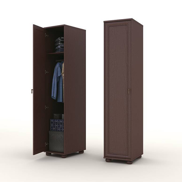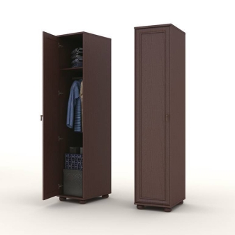 A single-door wardrobe is most often placed in small rooms because it has modest dimensions. This piece of furniture provides only a swing opening. It is also called a travel bag or pencil case. Here they store a minimum set of clothes for every day. It is equipped with a small number of shelves and a bar for hangers.