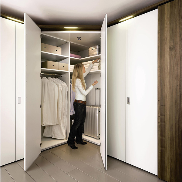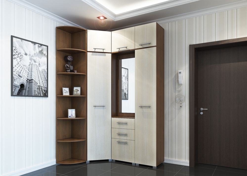For difficult spaces and hallways, a corner wardrobe is well suited. The most widely used method of placing a wardrobe is a wall. This option looks best in large spaces. In small rooms, two identical cabinets will look good, lined up along the wall - on both sides of the sofa or bed.