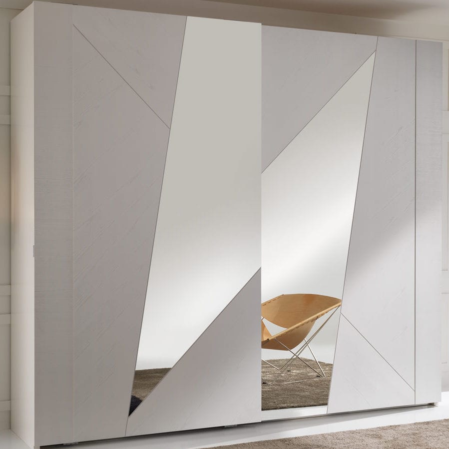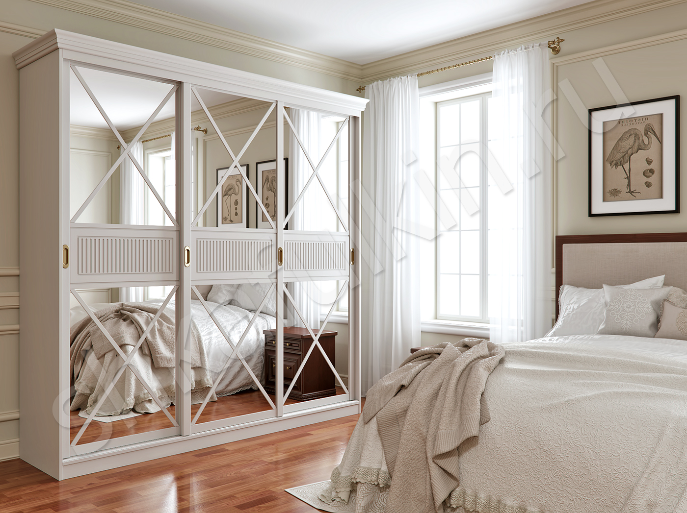 Mirrored wardrobe made in classic style. Due to the white color, it seems to dissolve in the interior of the bedroom, while remaining its important functional and decorative elements.