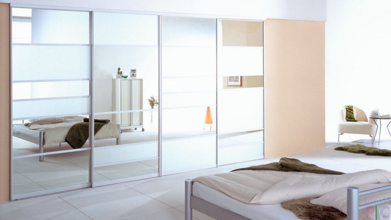 Wardrobe in the wall in the bedroom. Its size shakes, and the glossy surface of the doors allows you to visually make the room even more spacious.
