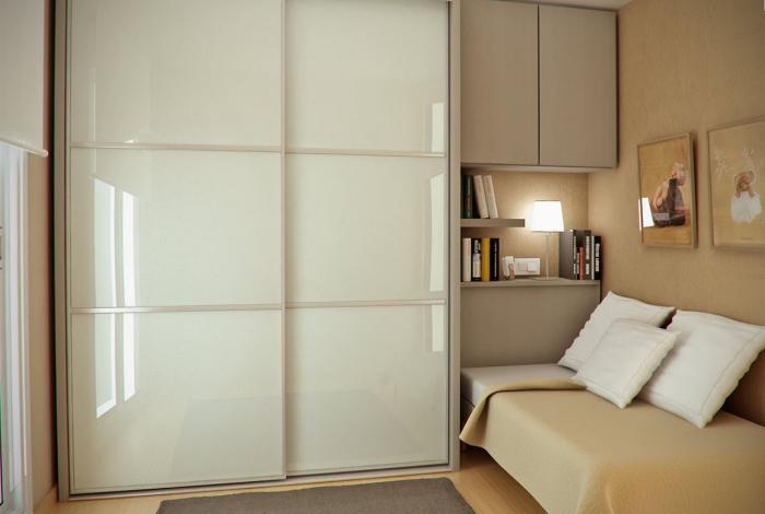 Small bedroom. The combination of dark color of the wardrobe and light color of the walls does not make the room smaller, but looks harmonious and calm.