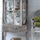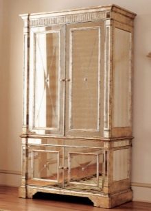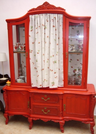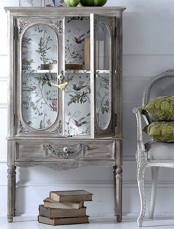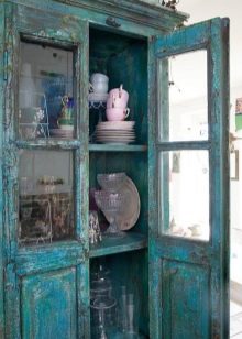 - plain fabric will give the closet an interesting look. It is necessary to choose textiles with a suitable pattern so that it resembles old patterns and fits into the interior. You can finish the furniture in whole or in part - only the facades. If the cabinet has glazed doors, then you can decorate the inside with a cloth - you can beat the back wall or the shelves;