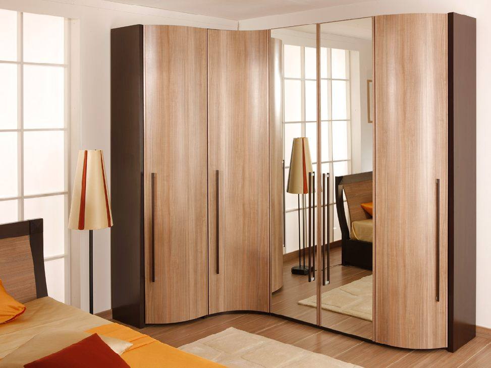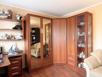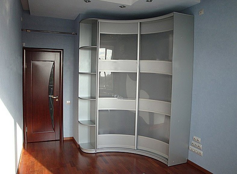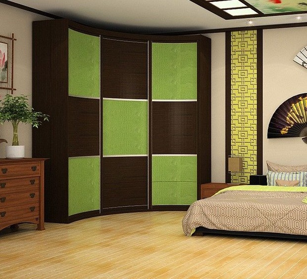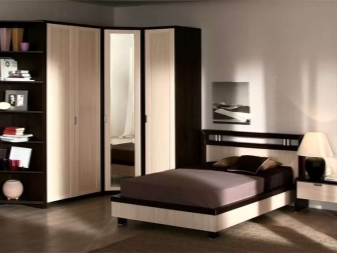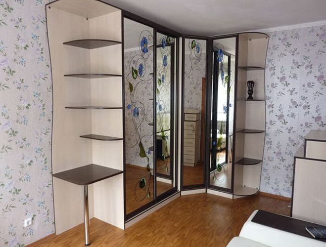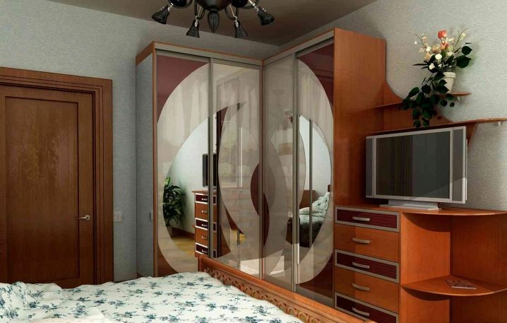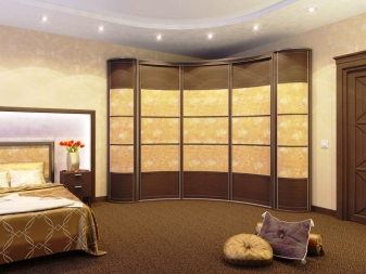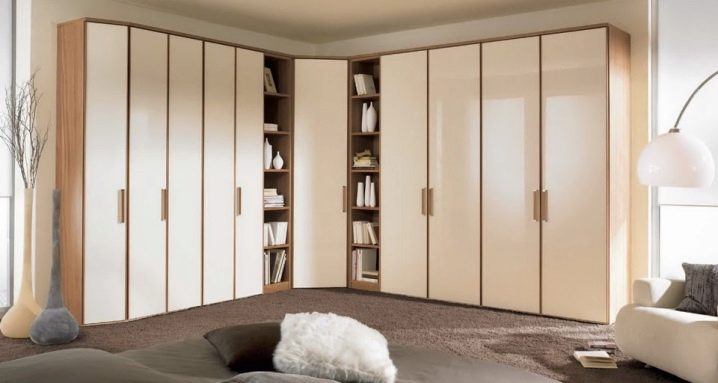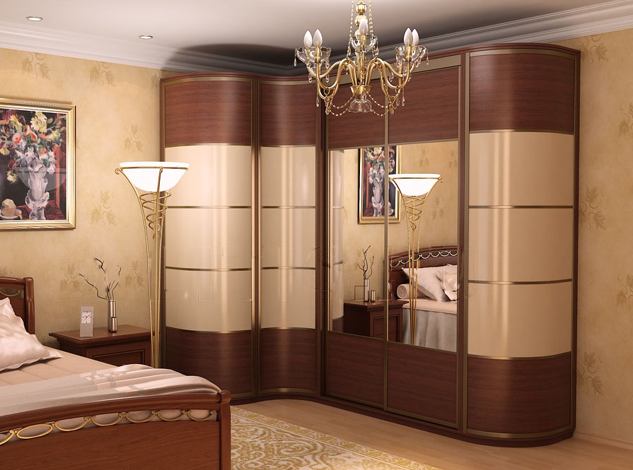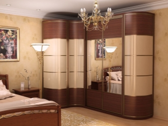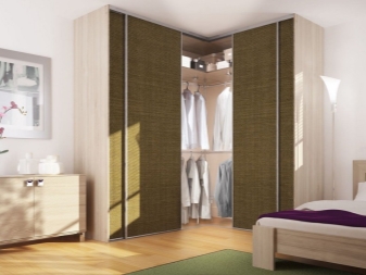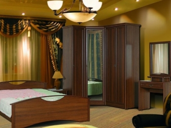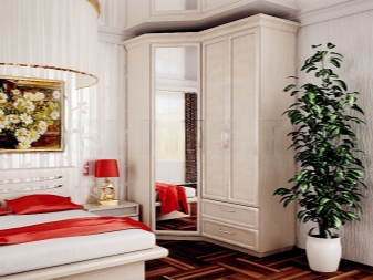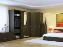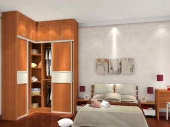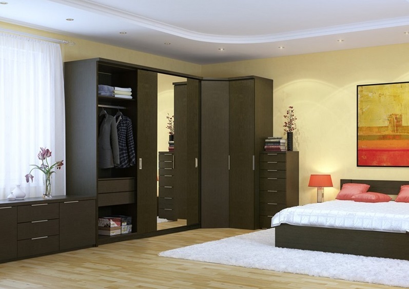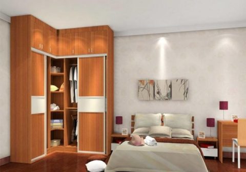 Installing a structure into a corner not only allows you to create the necessary space for storing things, but also fills up often neglected corner spaces.The number of compartments can be varied, it is limited only by the wishes of the owner and the size of the bedroom. Different forms and cabinets. Some of them are contraindicated for small bedrooms., but in large rooms look great and sometimes serve as a small dressing room.