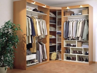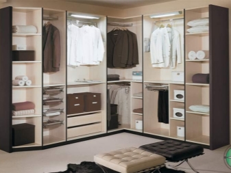 The classic L-shaped closet with a variety of compartments for storing various things allows you to place not only clothes, but also household items, such as bed linen, bath towels and the like. Such large options are well suited for small apartments, where the bedroom is the only place suitable for storing things.