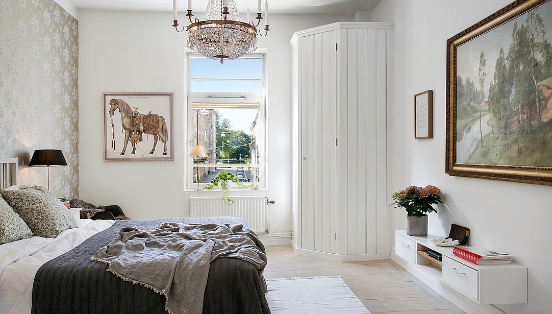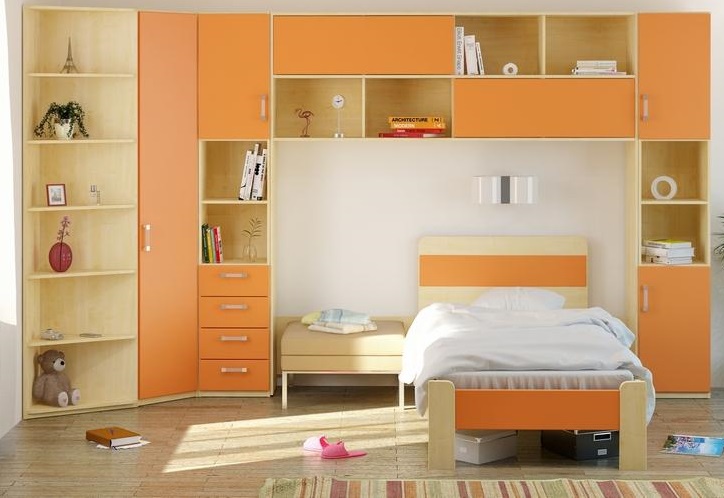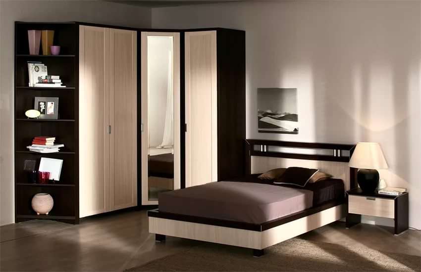 The size of the cabinet should be consistent with the size of the room. Small corner options are purchased in a miniature bedroom. A small cabinet allows you to put everything you need into it, without cluttering up space at the same time. However, it is not always the angular design stands together. For example, a modular wardrobe can be “scattered” around the room, placing almost the entire structure nearby, and a narrow element to another place, for example, through a door from the main body or on the other side of the head of the bed.Such solutions are good when the area does not allow to put an integral structure.