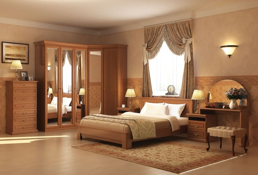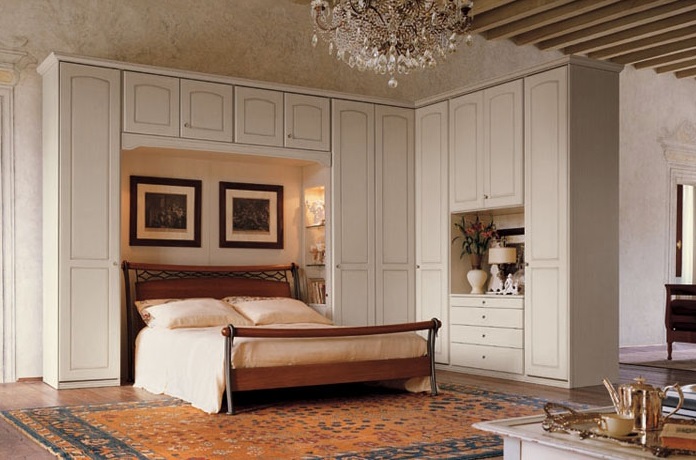 - For classic The bedrooms are suitable modular designs, the design of which harmoniously combines the compartments without doors and with doors. Corner closet should occupy the entire perimeter of the wall with the head of the bed. You can use mirror inserts, gilding and patterns.