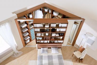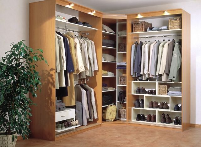All the space inside the corner wardrobe can be divided into upper, middle and lower zones. Downstairs most often store shoes, and above on the mezzanine have things that are rarely used. The middle zone is of the greatest interest to fill. It most often has the following: