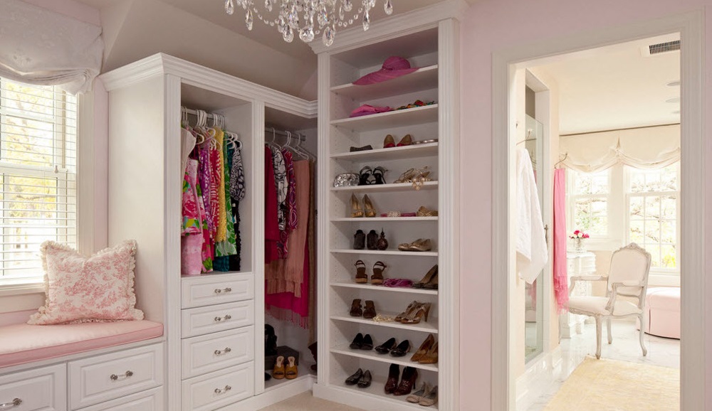 Corner closet does not have to have doors, sometimes open models look much more interesting. If a woman of fashion wants to put her collection on public display, open shelves are a suitable option. Having placed shoes on them, it will turn out to create an interesting decorative effect, making such a collection a center for interior composition.