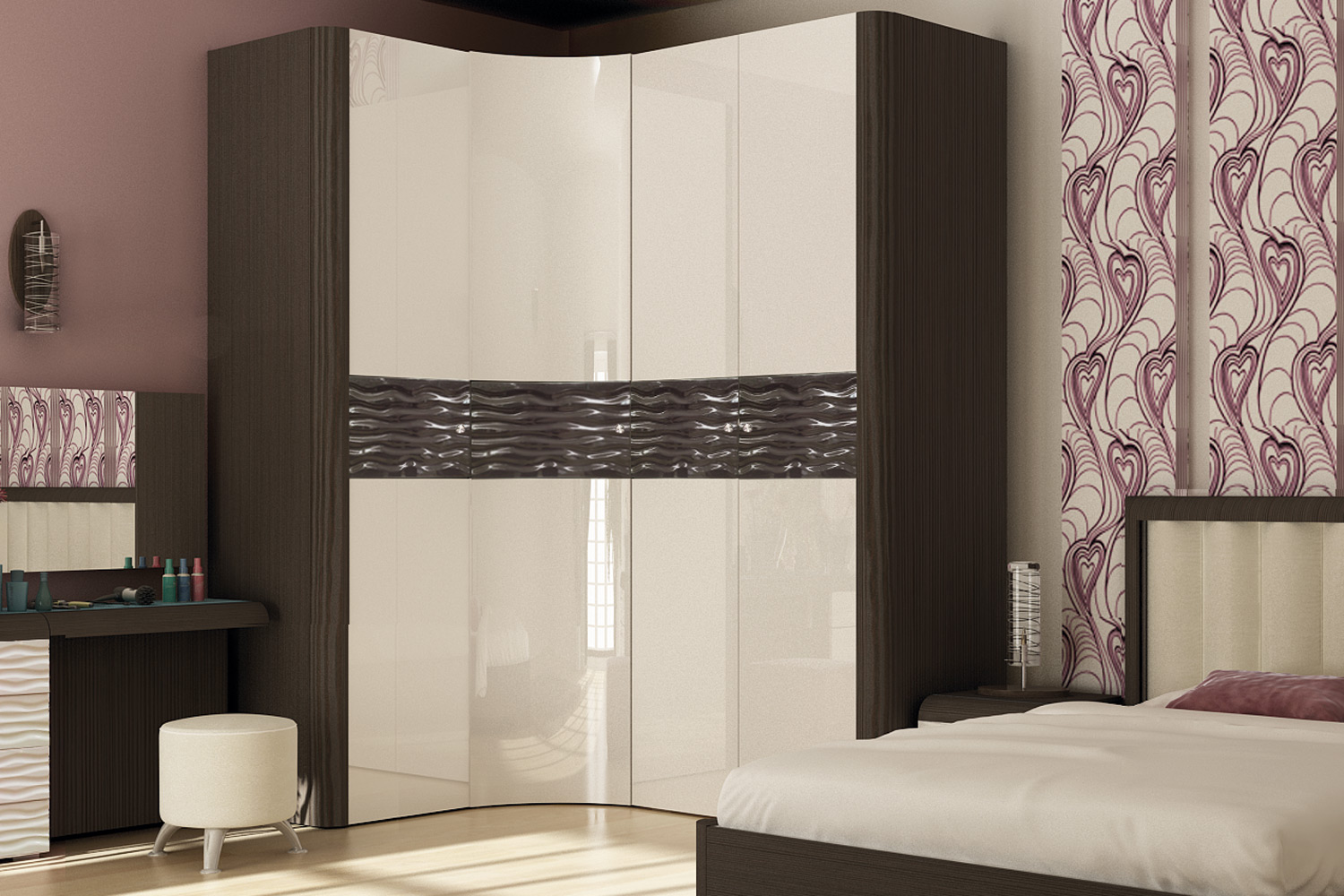 A beautiful glossy pattern fits perfectly into a modern small bedroom.The use of glossy surfaces creates the same effect as the use of mirrors: the area of the room expands. This corner cabinet of the combined type, as well as ordinary swing doors, it has a folding door in the corner of the accordion.