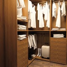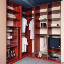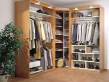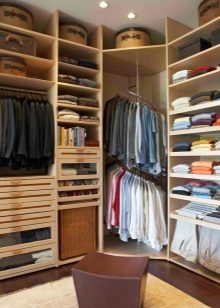 T-shirts and sweaters are conveniently placed on small, small shelves.When there are hooks on the walls of the closet, use them for bathrobes or bags. A short crossbar will be useful for storing belts and ties. Also a great idea would be to place a retractable ironing board in a large closet. This is a very convenient and practical option that will help you save space and maintain order in the room.