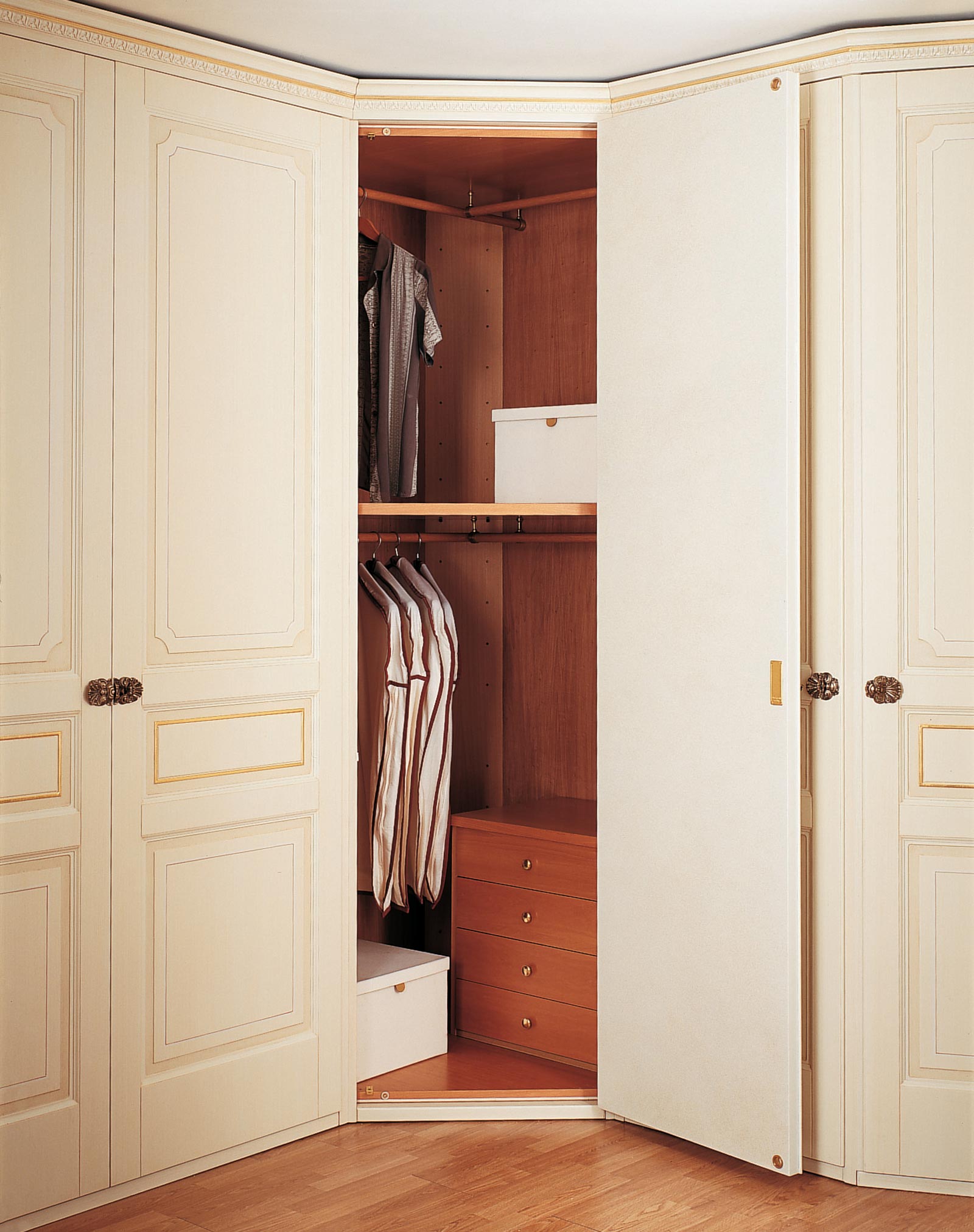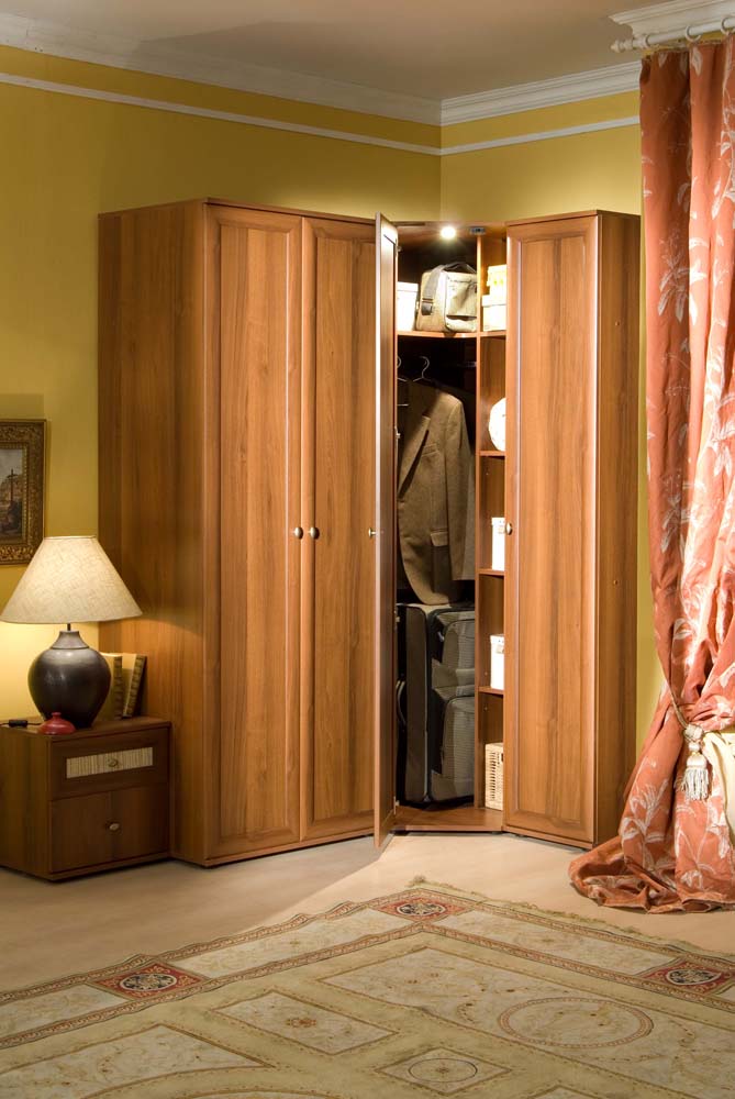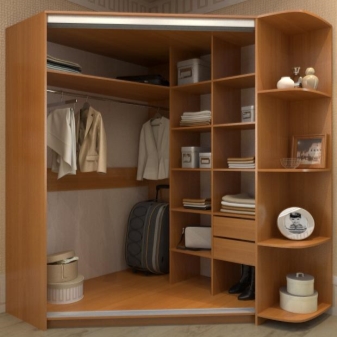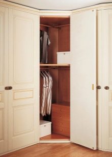 In the lower compartment of the corner cabinet in the bedroom, it is also best to place shoes or to place there any heavy objects that you want to hide from prying eyes.