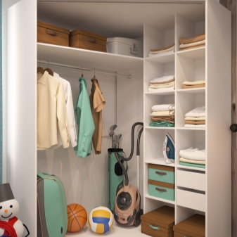 If your corner cabinet has long compartments without transverse shelves, you should save them for storing sports equipment. For example, alpine skiing, trekking poles, or for accessories - umbrellas, walking sticks, etc. Small drawers are perfect for placing hats, scarves and gloves. This applies to situations where there are no special hangers for the listed items in the hallway.