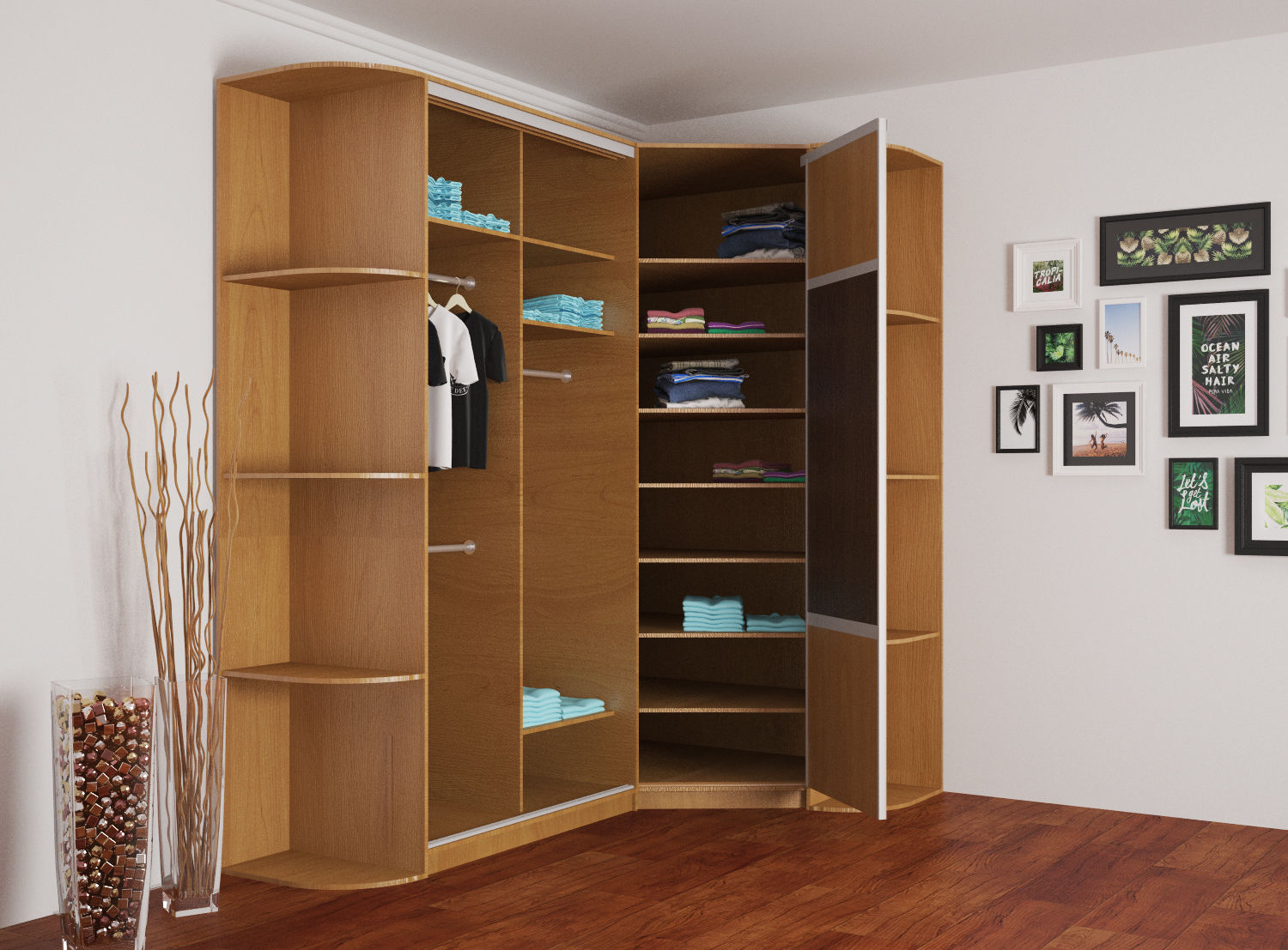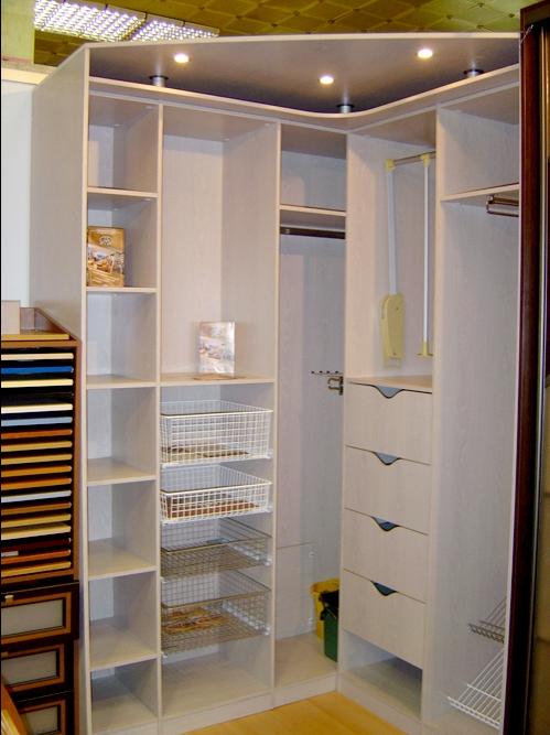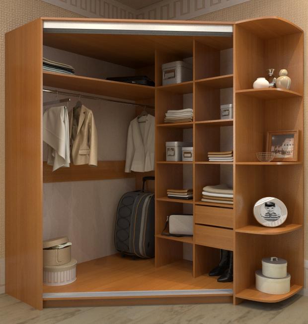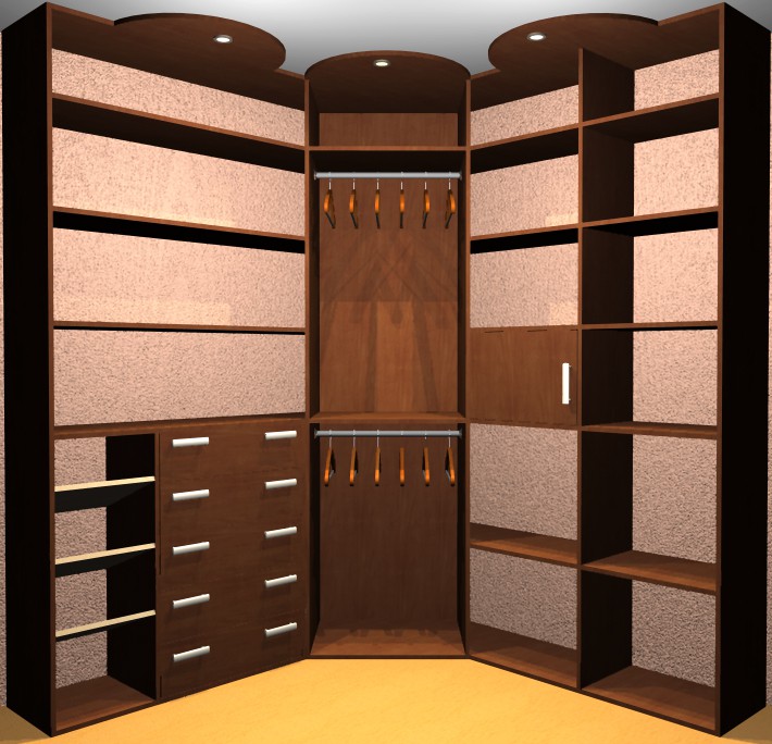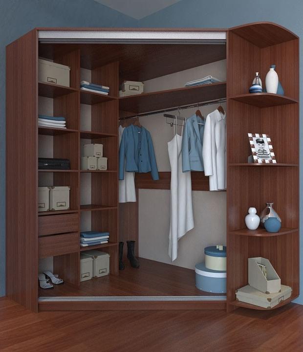 Now consider specific examples of the internal design of the corner cabinet for certain types of rooms.